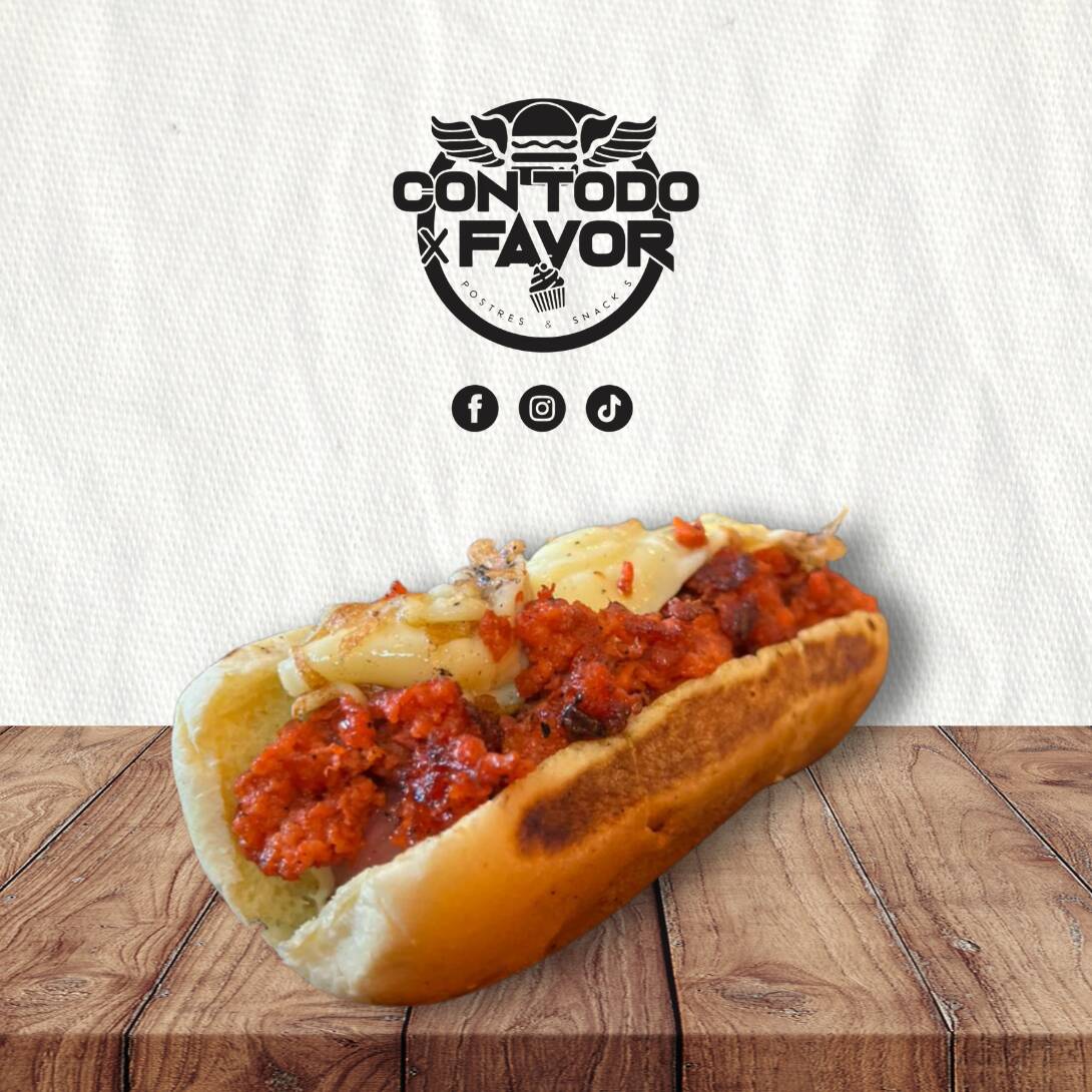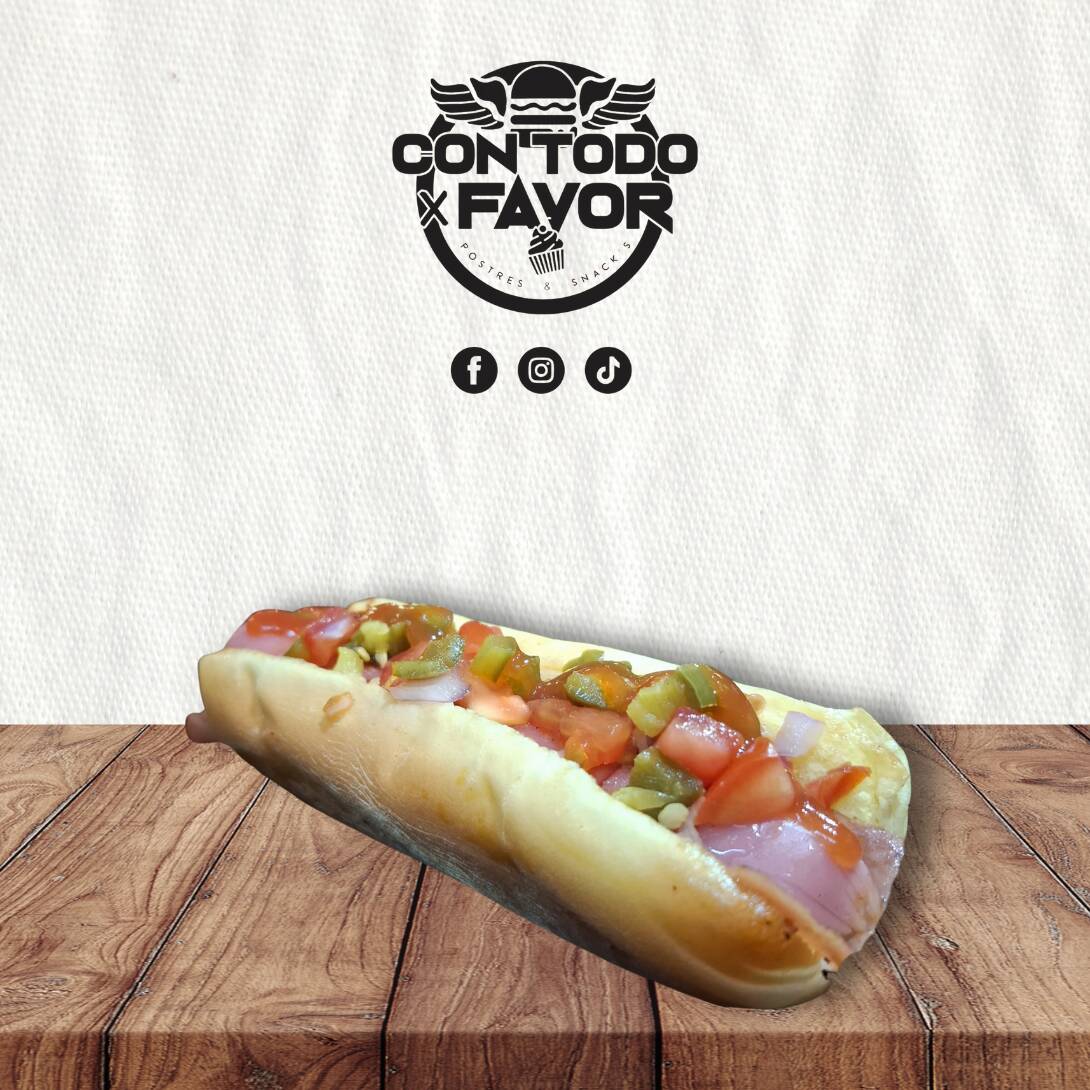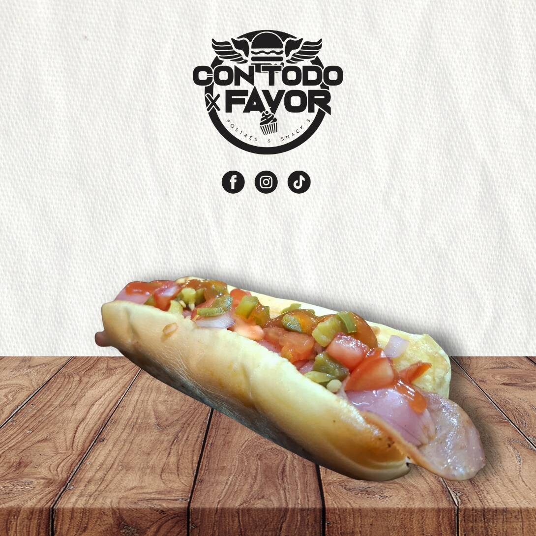 Pan, salchicha, chorizo con queso manchego, mayonesa, cátsup, cebolla, jitomate y rajas