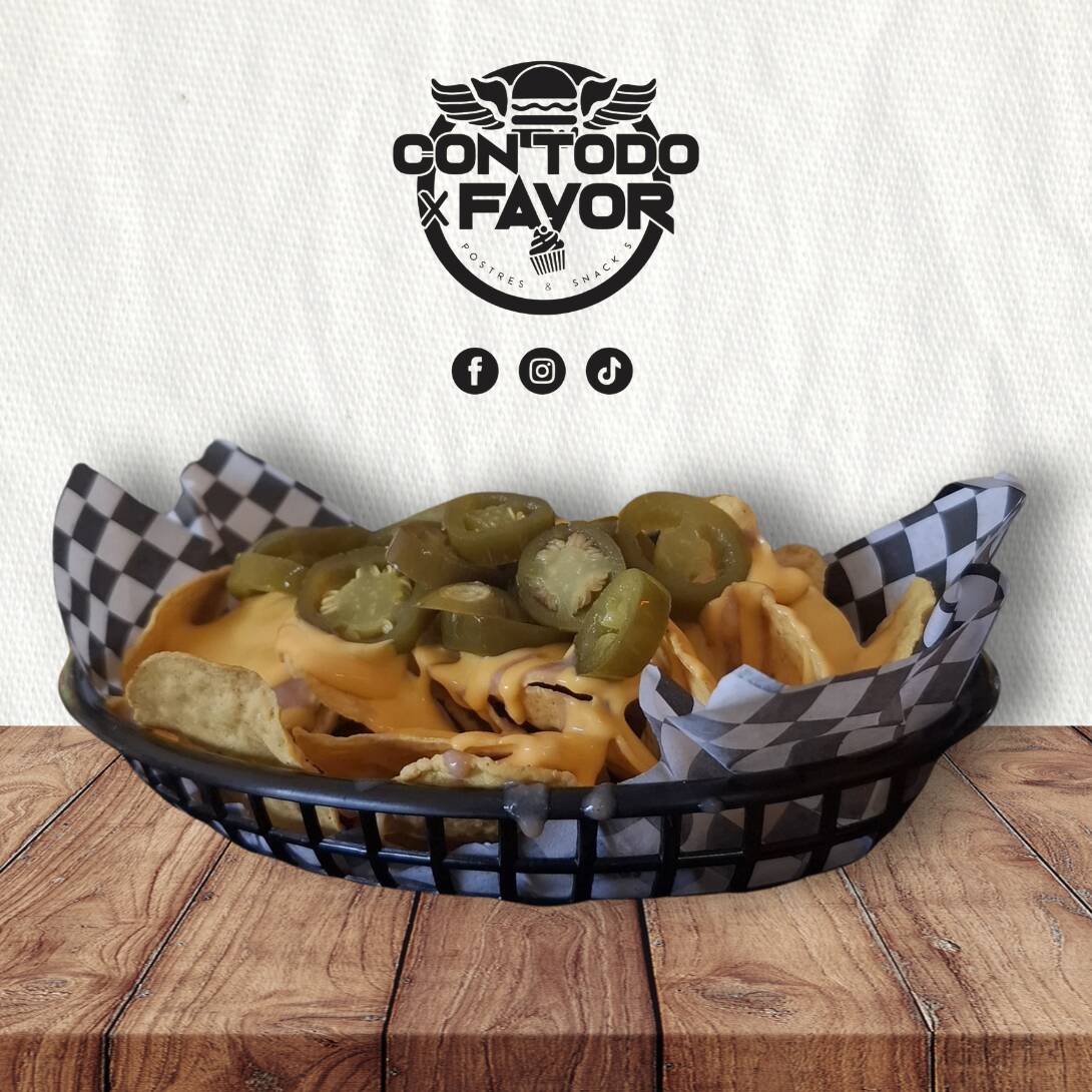 Totopos de maíz bañados con frijoles refritos, queso amarillo, pico de gallo, chorizo, aderezo guacamole-habanero y rajas.