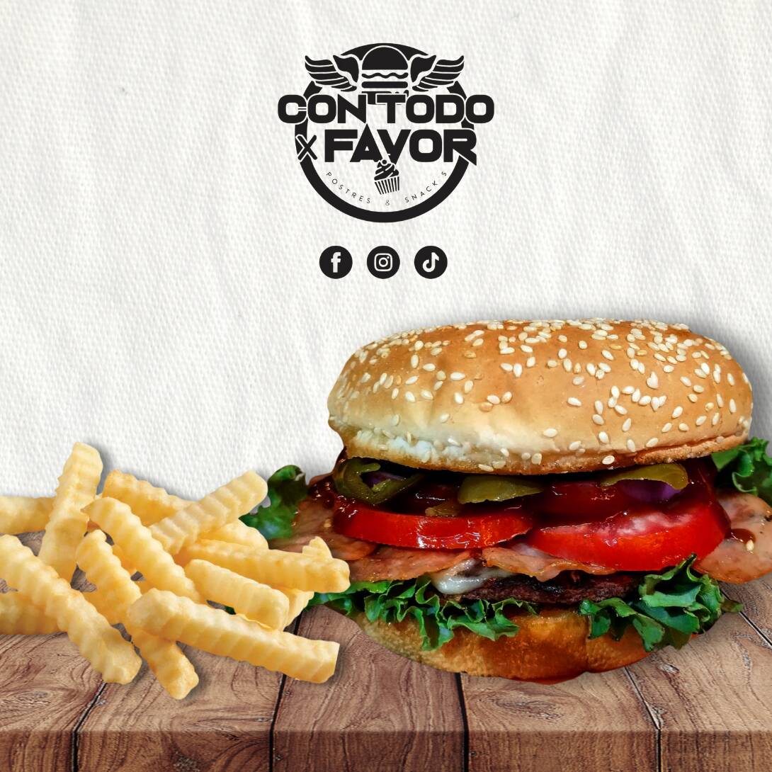 Pan, carne, queso manchego, tocino, jitomate, cebolla, lechuga, cátsup, mayonesa y rajas. Incluye pequeña porción de papas