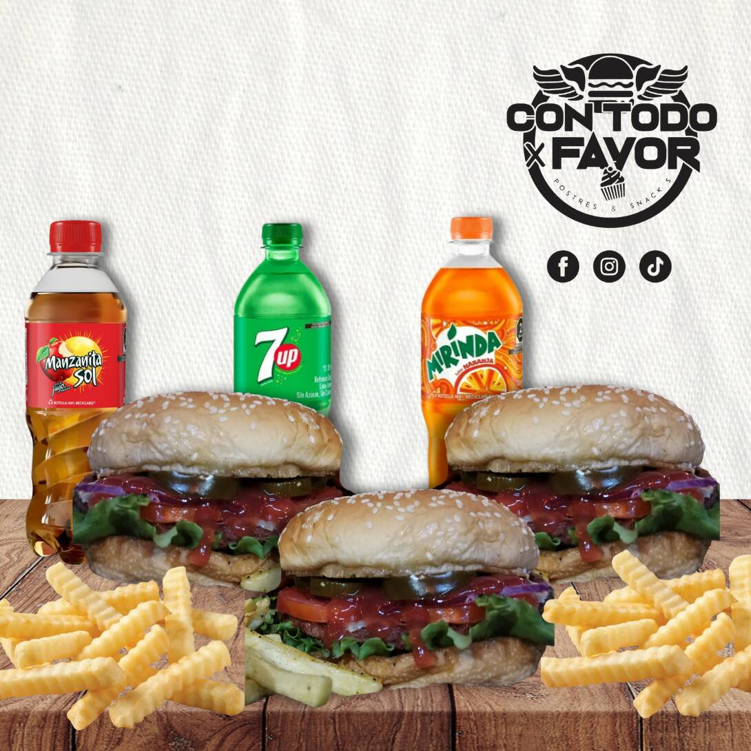 3 Burger clásicas (cada una con su porción de papas) + 3 Refrescos de 355ml