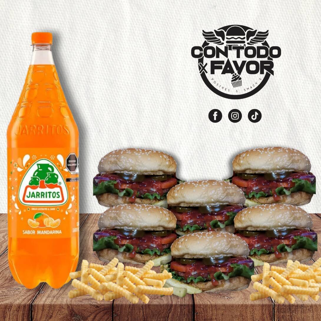 6 Burger clásicas (cada una con su porción de papas) + 1 Refresco de 2L.