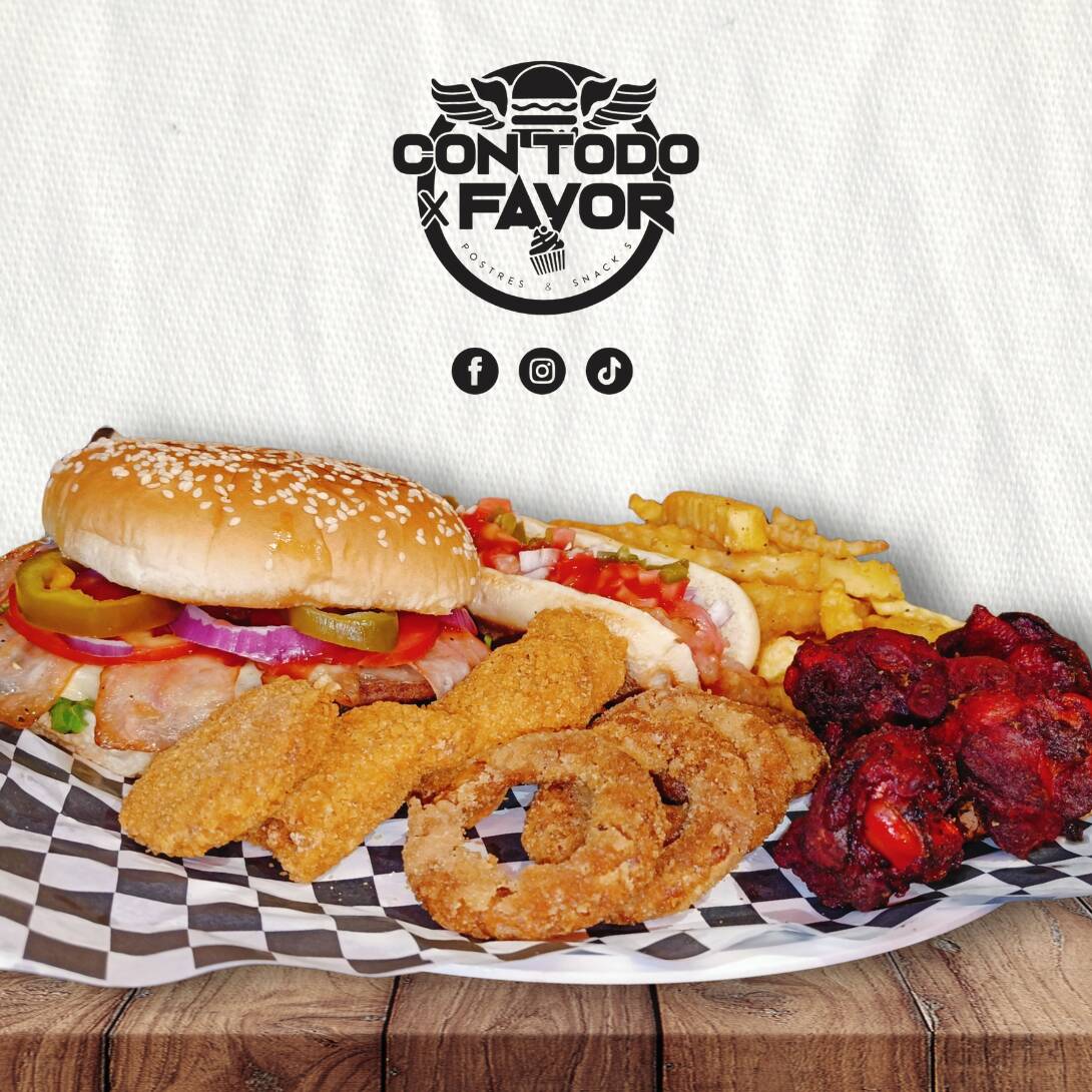 1 Burger tocino + 1 jocho tocino + 4 alitas + 4 aros de cebolla + 4 nuggets + porción de papas