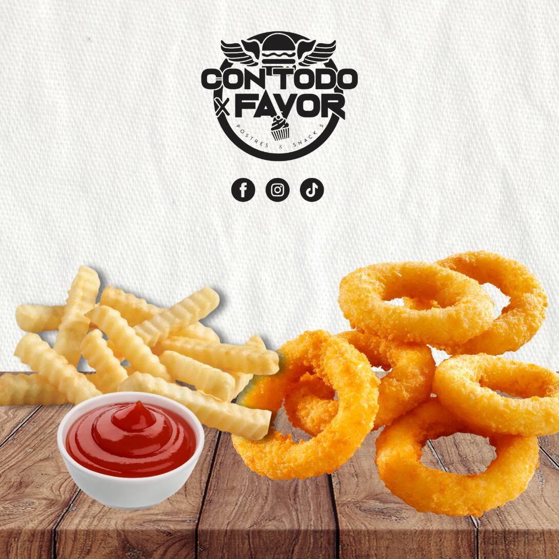 6 piezas de aros de cebolla. Incluye porción de papas