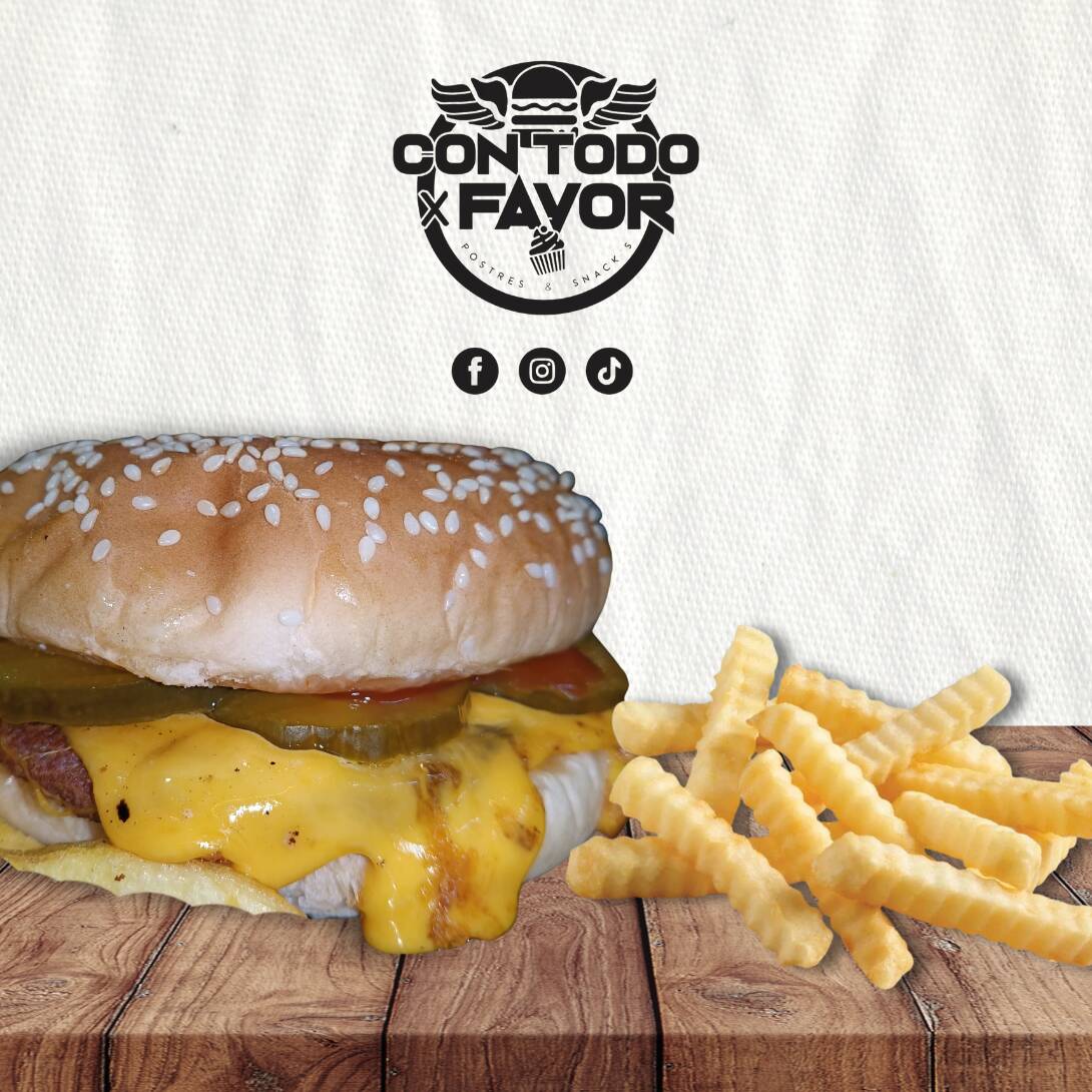 Pan, carne, queso cheddar, mayonesa, cátsup, pepinillos y rajas. Incluye pequeña porción de papas