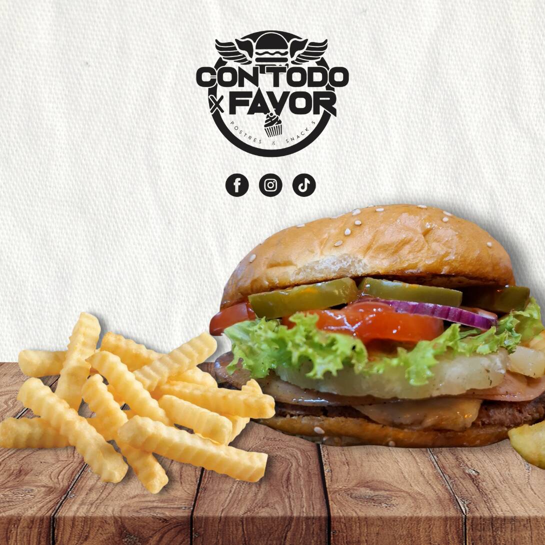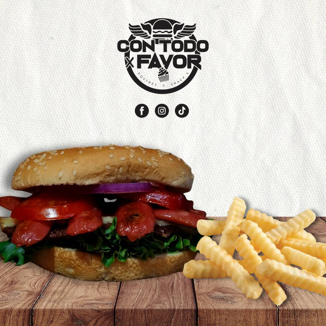 Pan, carne, queso manchego, salchichas, jitomate, cebolla, lechuga, cátsup, mayonesa y rajas. Incluye pequeña porción de papas