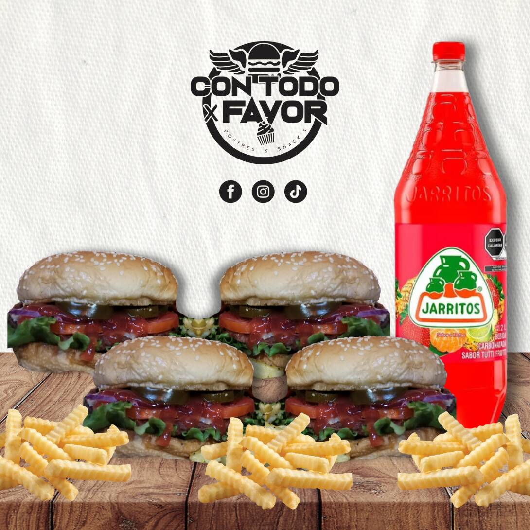 4 Burger clásicas (cada una con su porción de papas) + 1 Refresco de 2L.