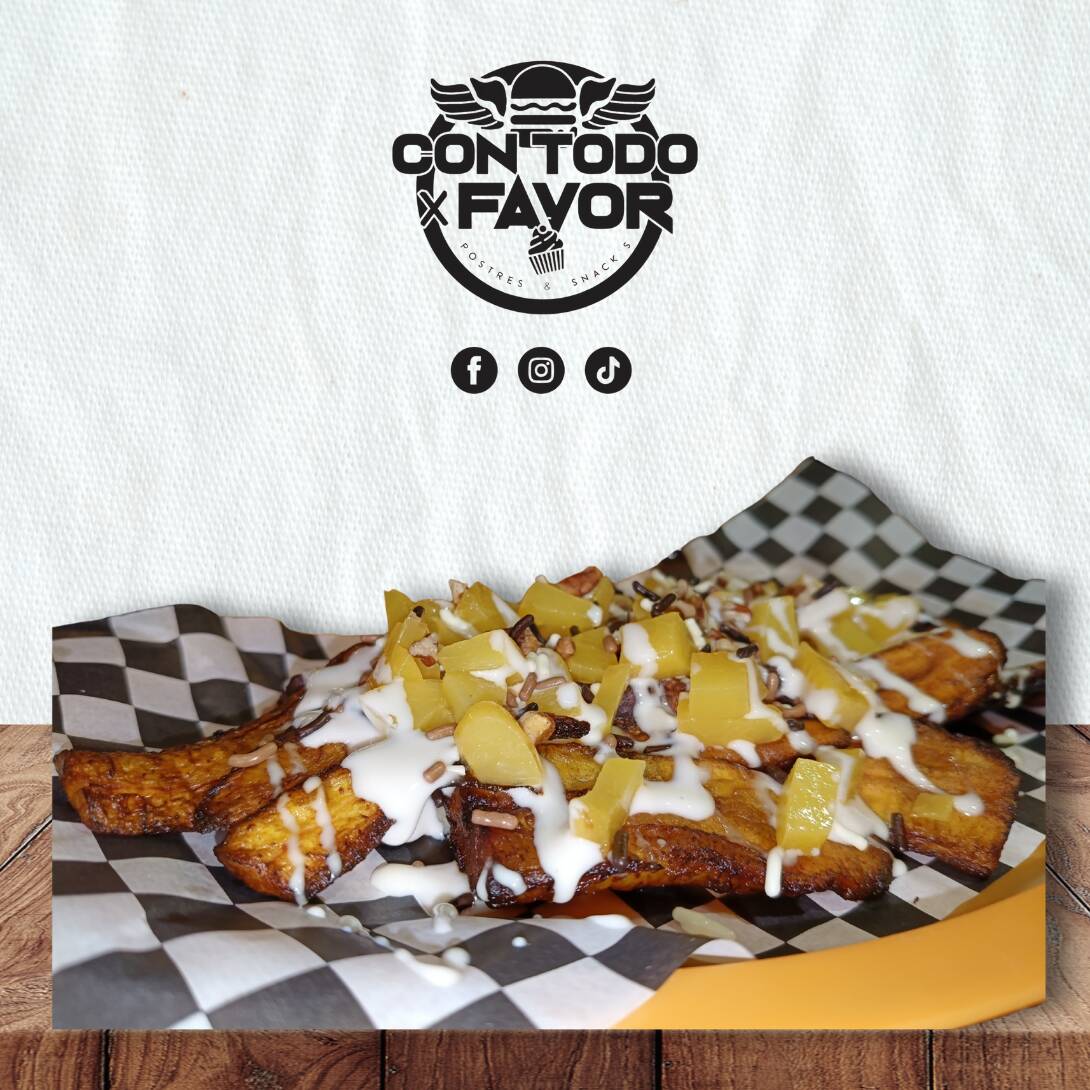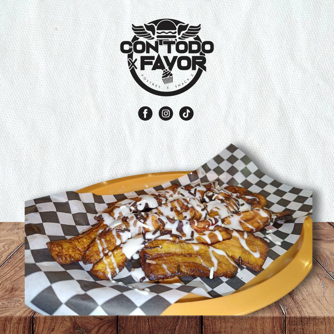 Plátano macho frito, bañados con nuestra crema preparada, lechera, fruta a elegir (fresa o durazno) y granillo de chocolate .