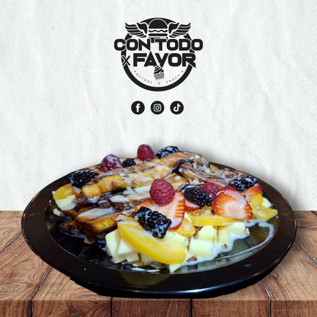 Plátano macho frito acompañado de manzana, durazno, fresa, frutos rojos, nuestra crema preparada, lechera, nuez y granillo de chocolate.