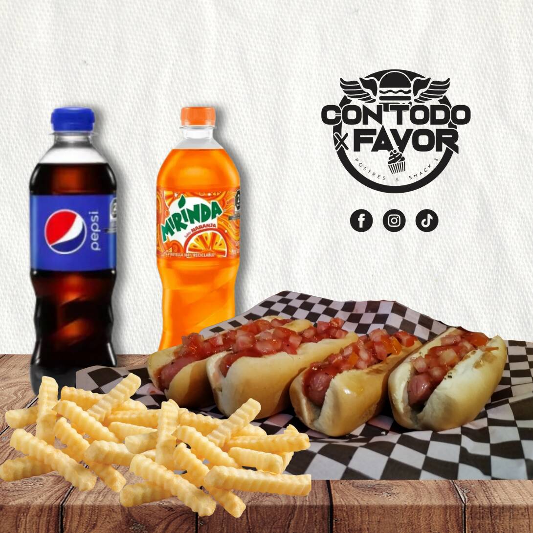 4 Jochos sencillos (cada uno con su porción de papas) + 2 Refrescos de 355ml