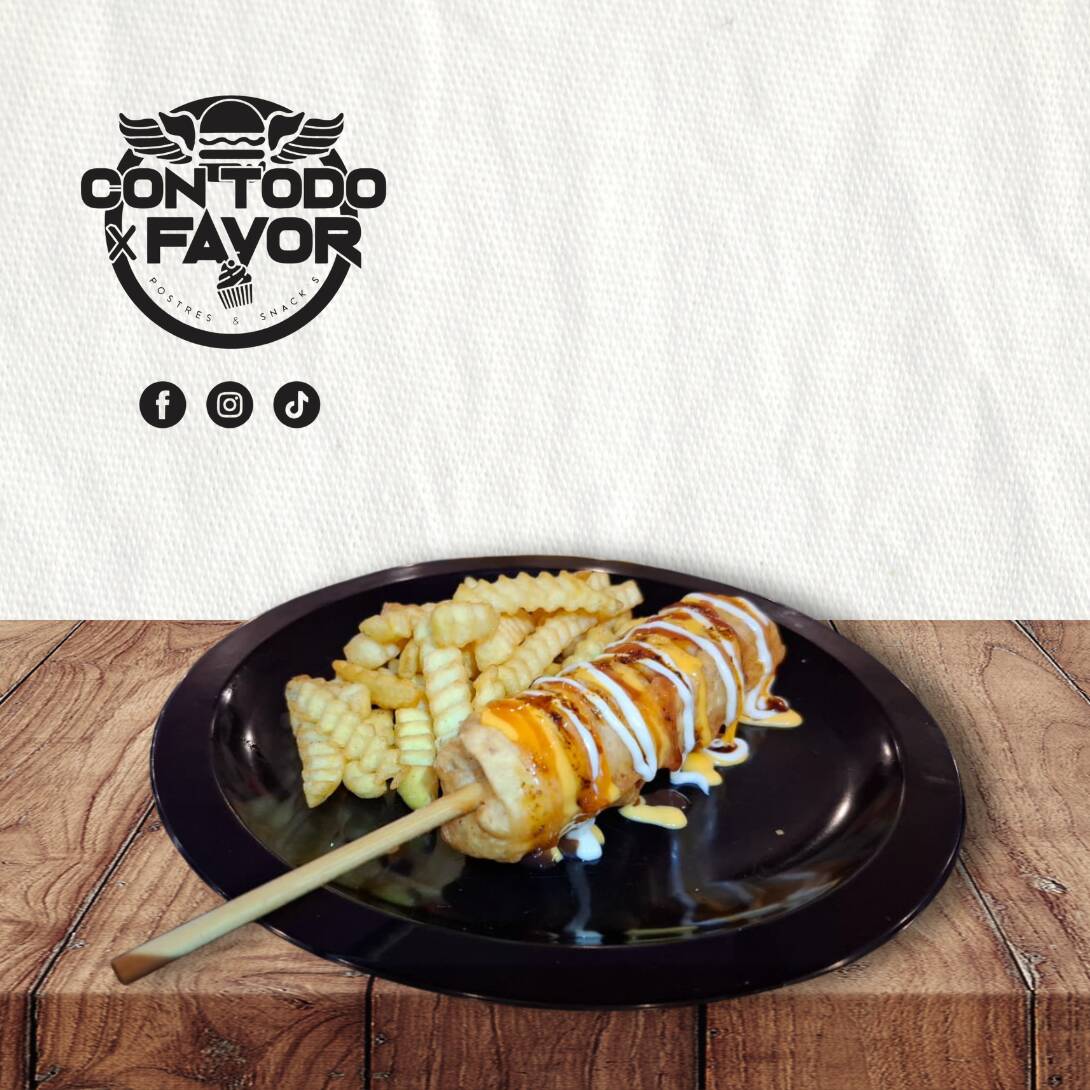 Incluye pequeña porción de papas. Salchicha envuelta en tortilla de harina, tocino, queso manchego, frita con nuestra masa.