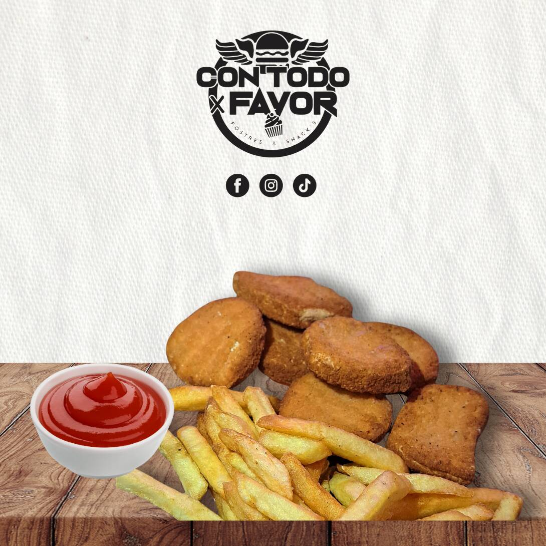 6 piezas de nuggets de pollo. Incluye porción de papas