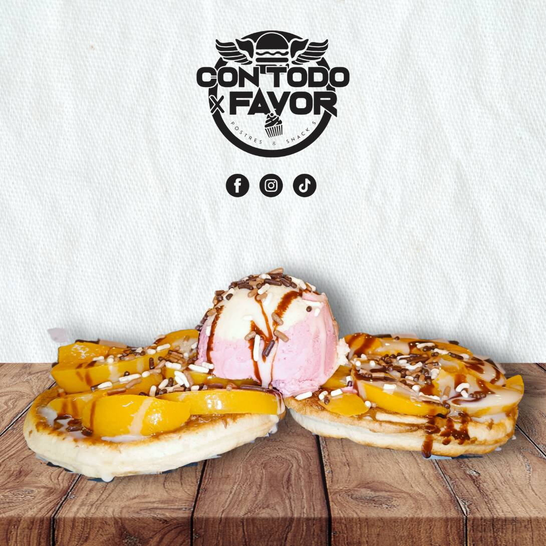 2 piezas de Waffles, preparados con Nutella, lechera, fruta a elegir (fresa o durazno), bola de helado, chocolate liquido y granillo de chocolate.