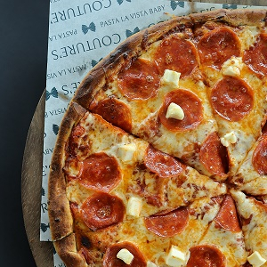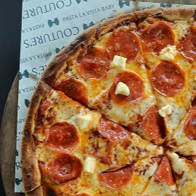 Pizza con salsa de tomate, queso mozzarella, pepperoni EXTREMO y orilla dorada con nuestro delicioso pomodoro de la casa.... te encantará