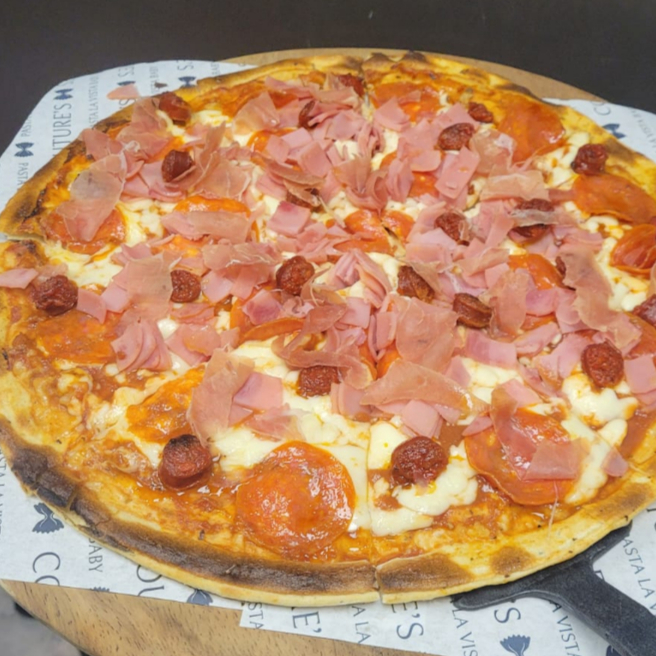 salsa de tomate, queso mozzarella, pepperoni, jamon serrano, chistorra y jamón york, una opción repleta de carnes y sabor