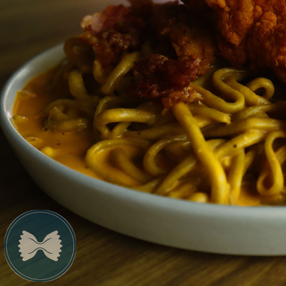 Porción individual, Mac and Cheese de bigoli, con pollo crispy, trocitos de tocino, queso parmesano y un toque de aceite de trufa
