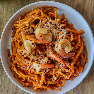 Porción individual, Picante y diferente, salsa a base de jitomate , crema, parmesano, especias y delicioso peperoncino, acompañada de camarones salteados