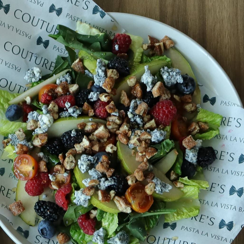 Porción individual, Ensalada de lechuga italiana, espinacas, pera, mora azul, queso de cabra cenizo, nuez garapiñada y un toque de reducción de vinagre balsámico, !te encantara¡