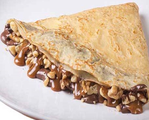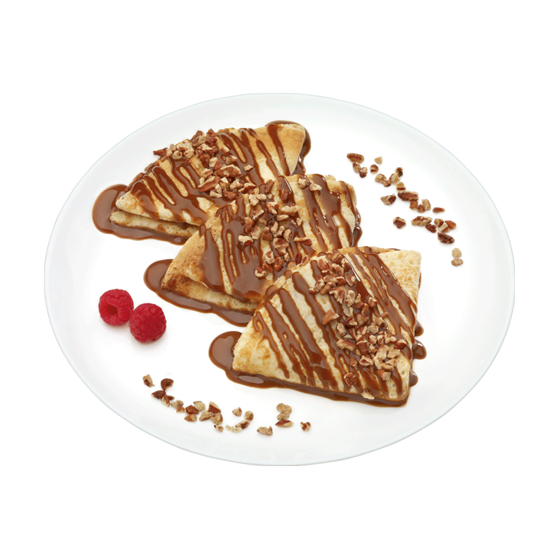 Tres crepas con queso philadelphia, cajeta, crema de café y nuez.