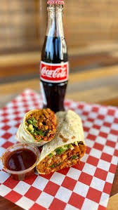 Carne al pastor, piña, cilantro, cebolla, queso y tortilla de harina + Refresco
