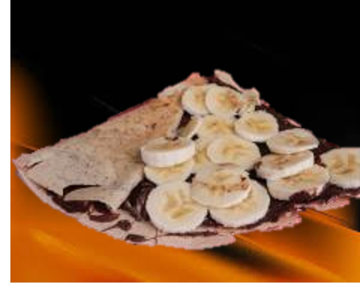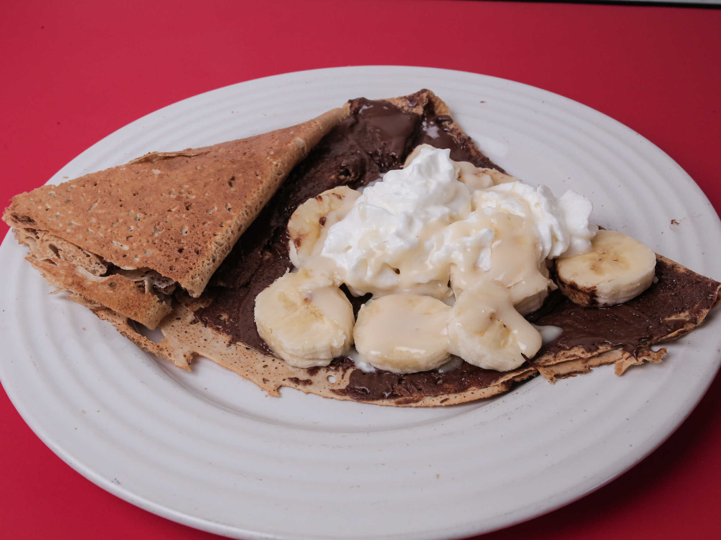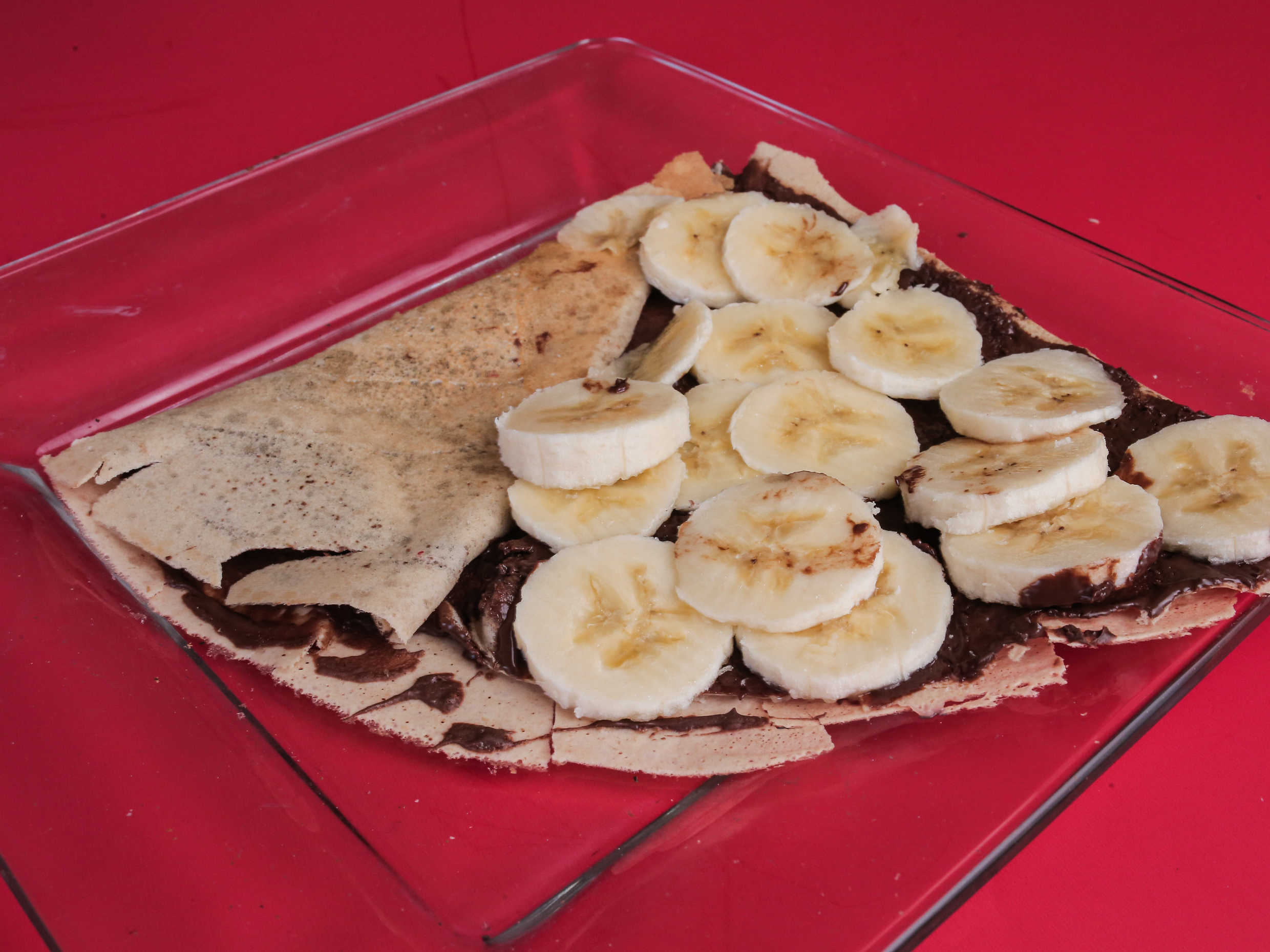 Rellena de Nutella, plátano rebanado, crema batida y lechera