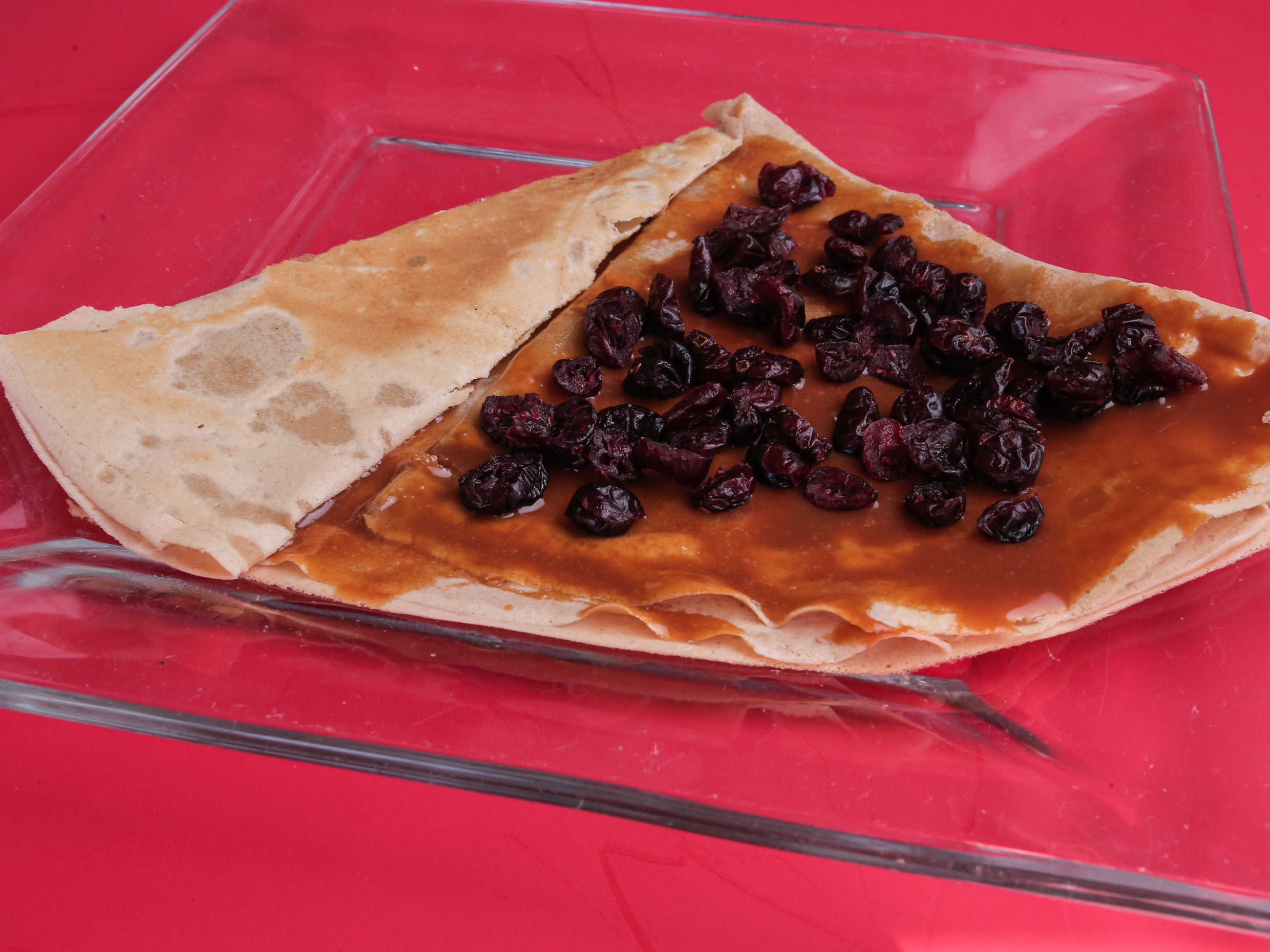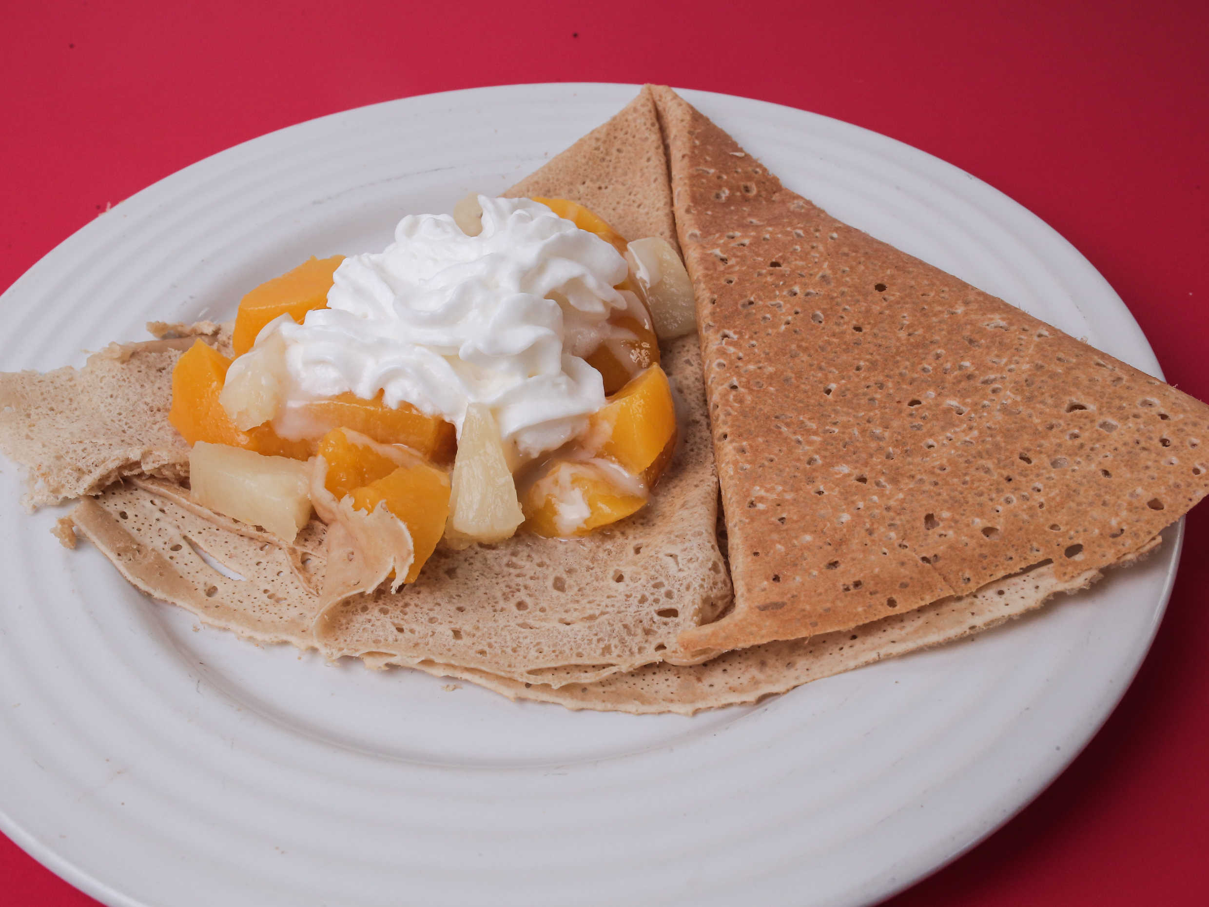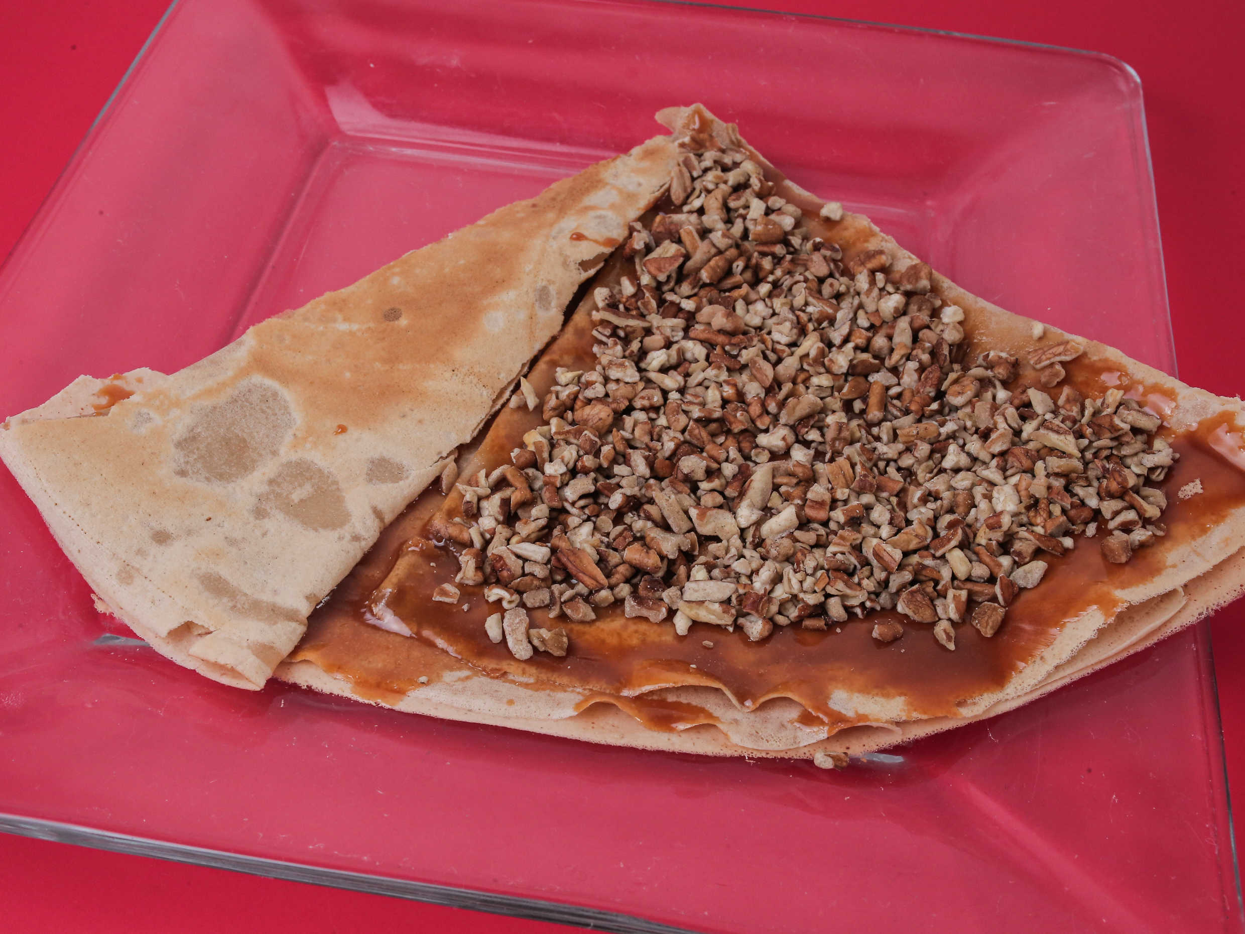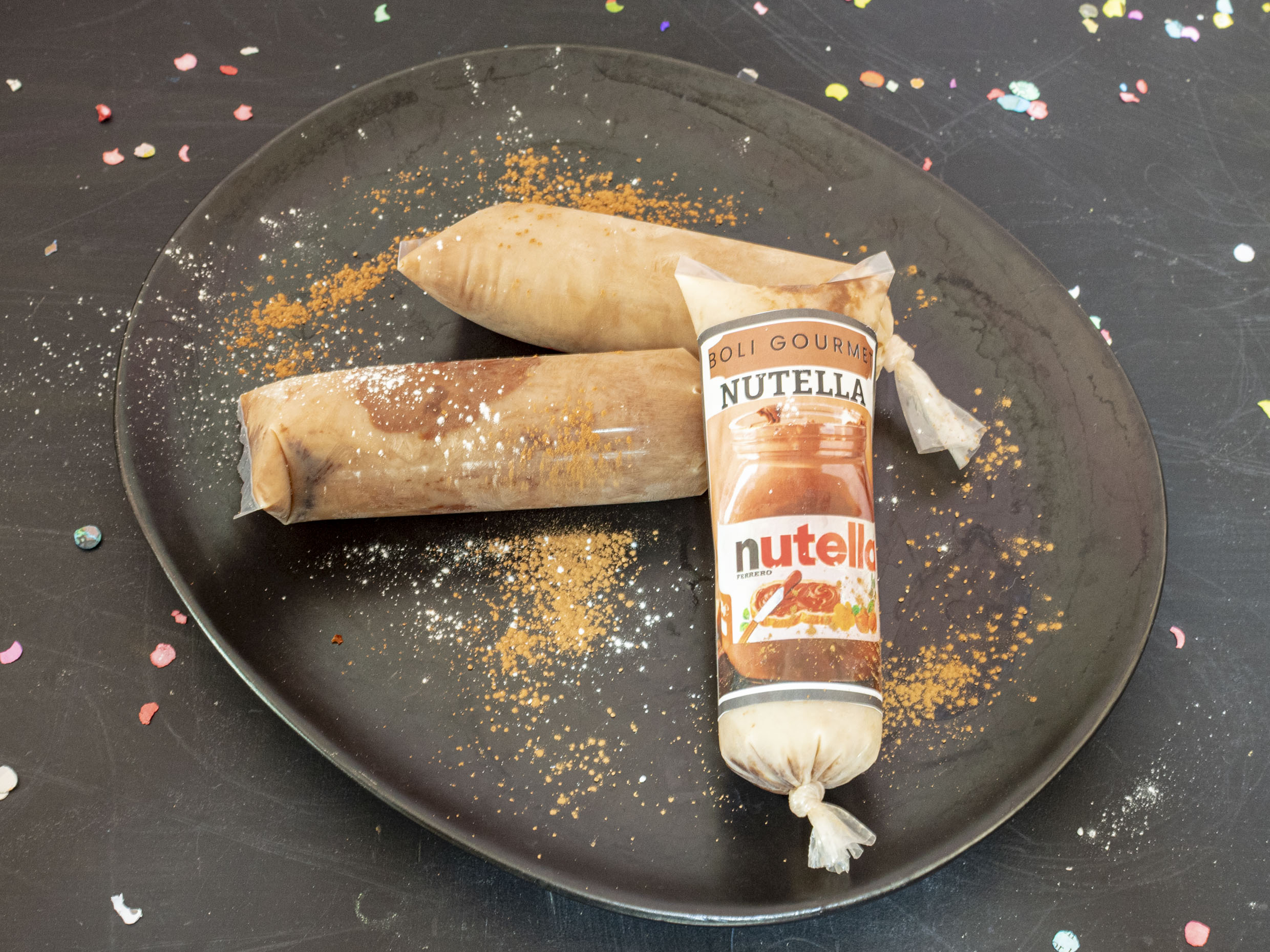 Rellena de Nutella, plátano rebanado, crema batida y lechera