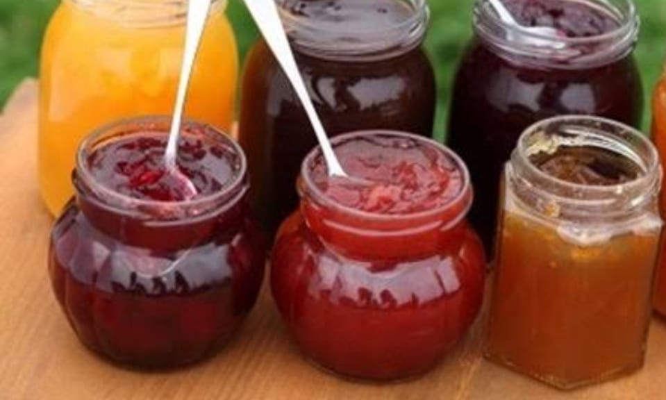 Mermelada de chabacano, fresa, zarzamora, manzana canela