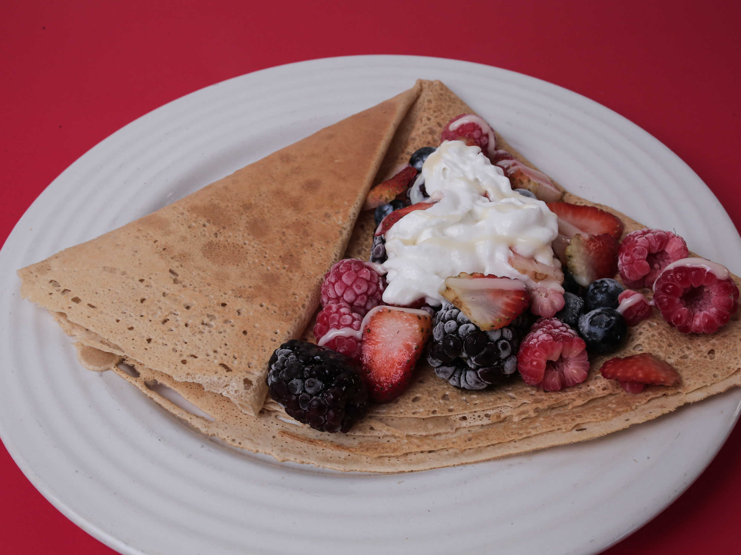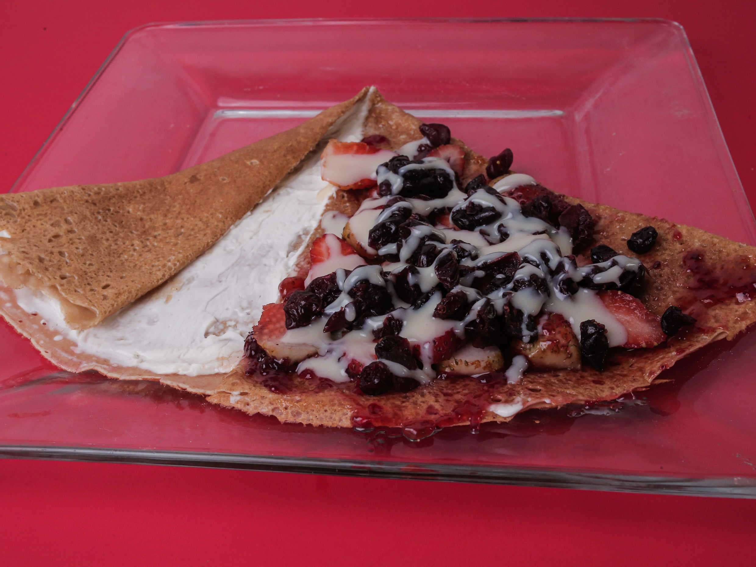 Rellena de moras azules, frambuesas naturales, fresas rebanadas, zarzamora, crema batida y lechera