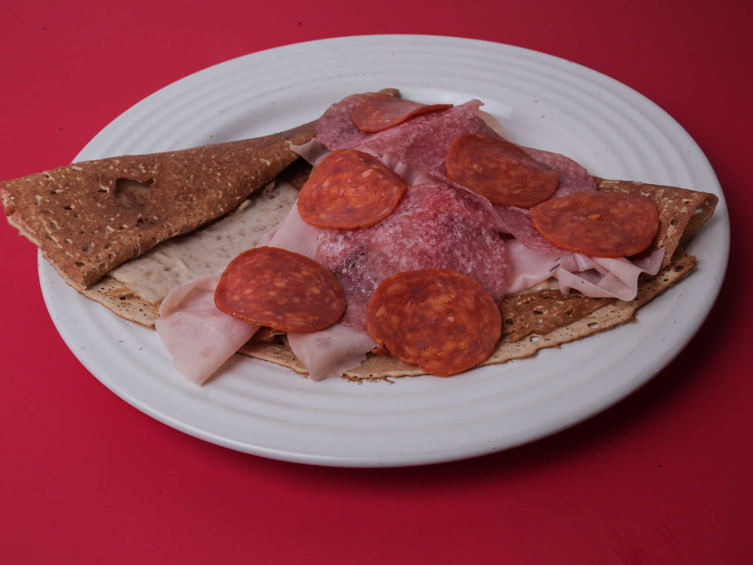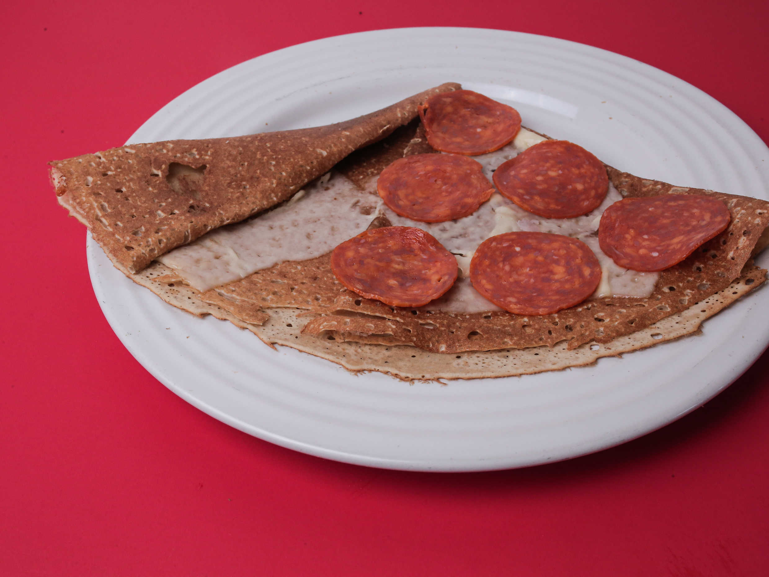 Rellena de dos rebanadas de queso manchego fundido, dos rebanadas de jamón de pierna, salami, pepperoni, pimienta y picante al gusto habanero, buffalo, chipotle o Valentina