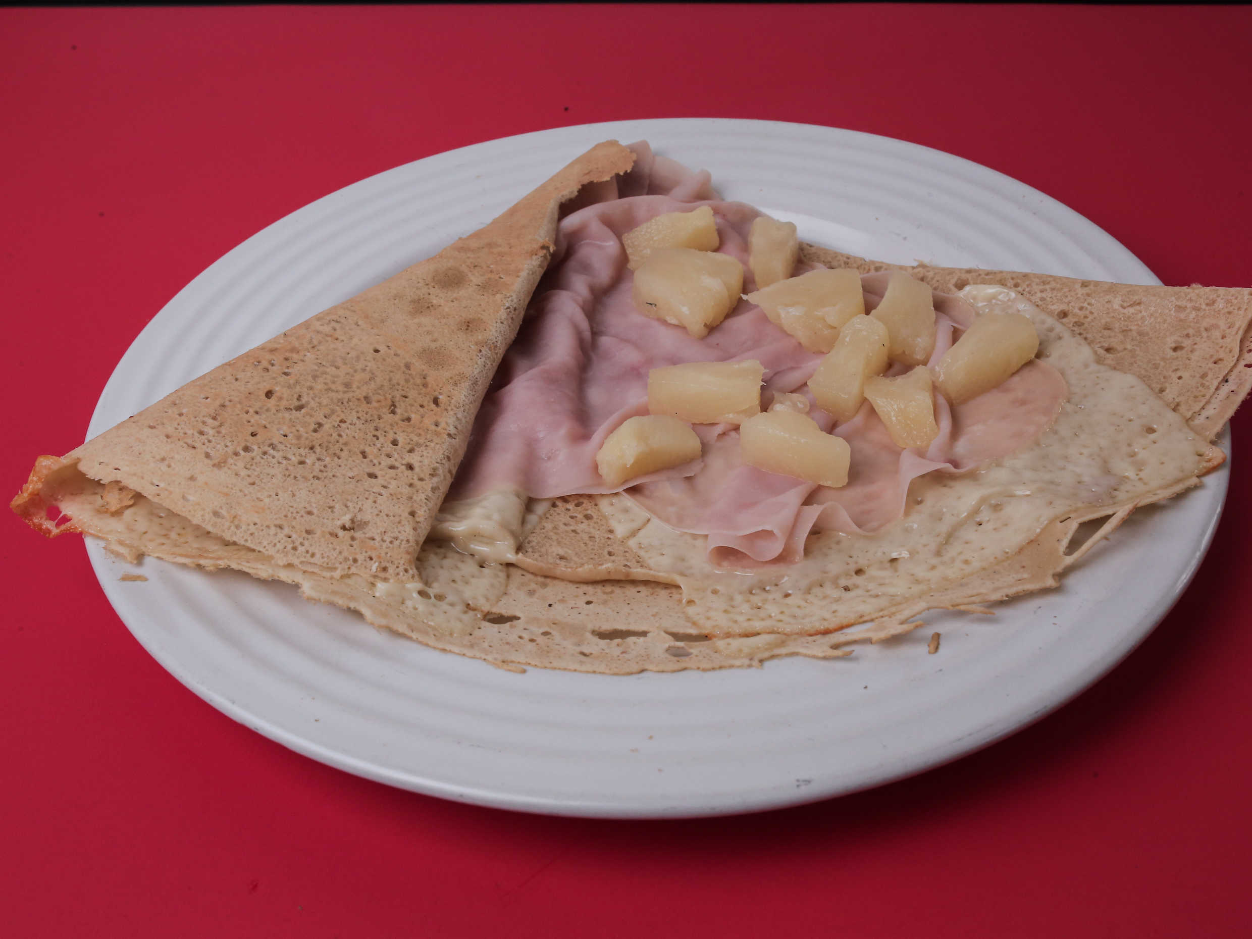 Rellena con dos rebanadas de queso manchego fundido, dos rebanadas de jamón de pierna y trozos de piña en almíbar