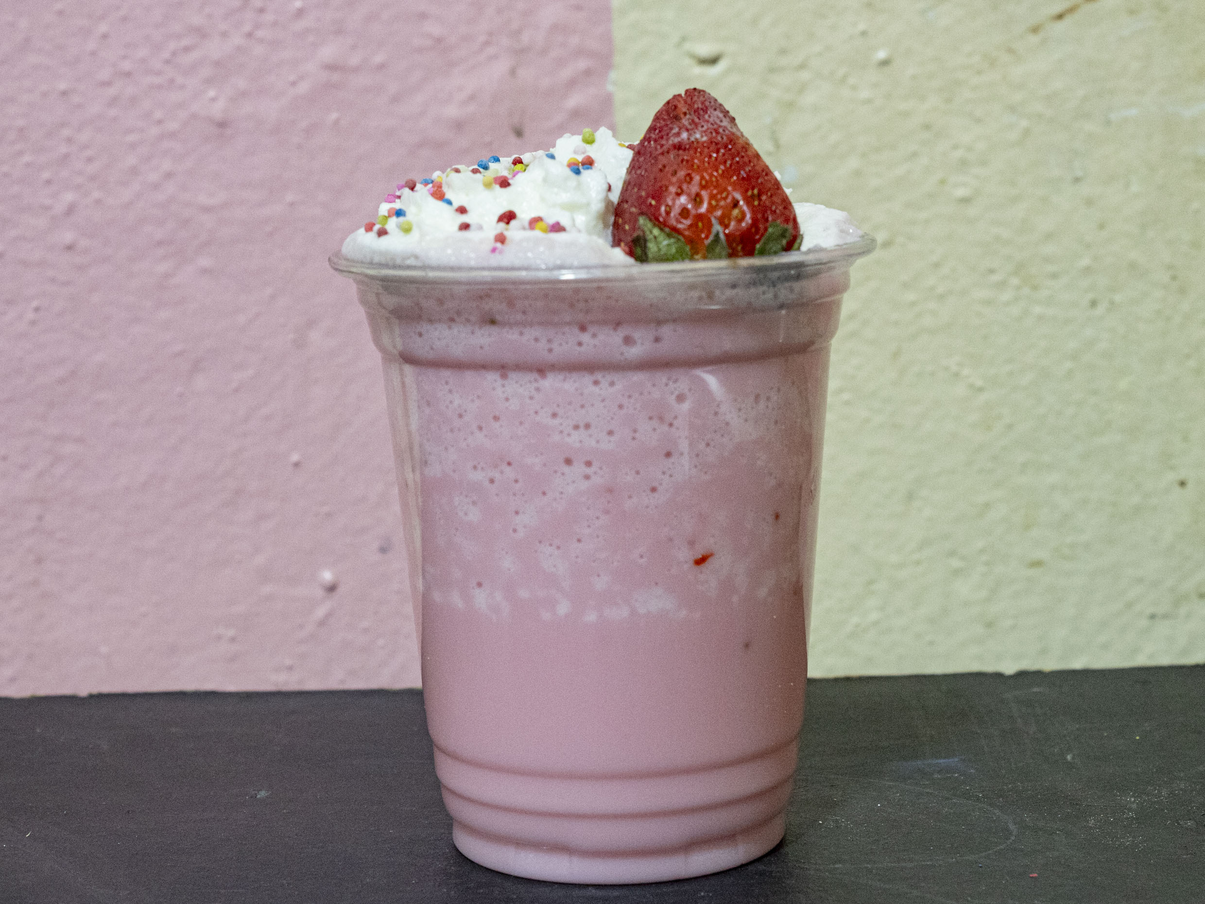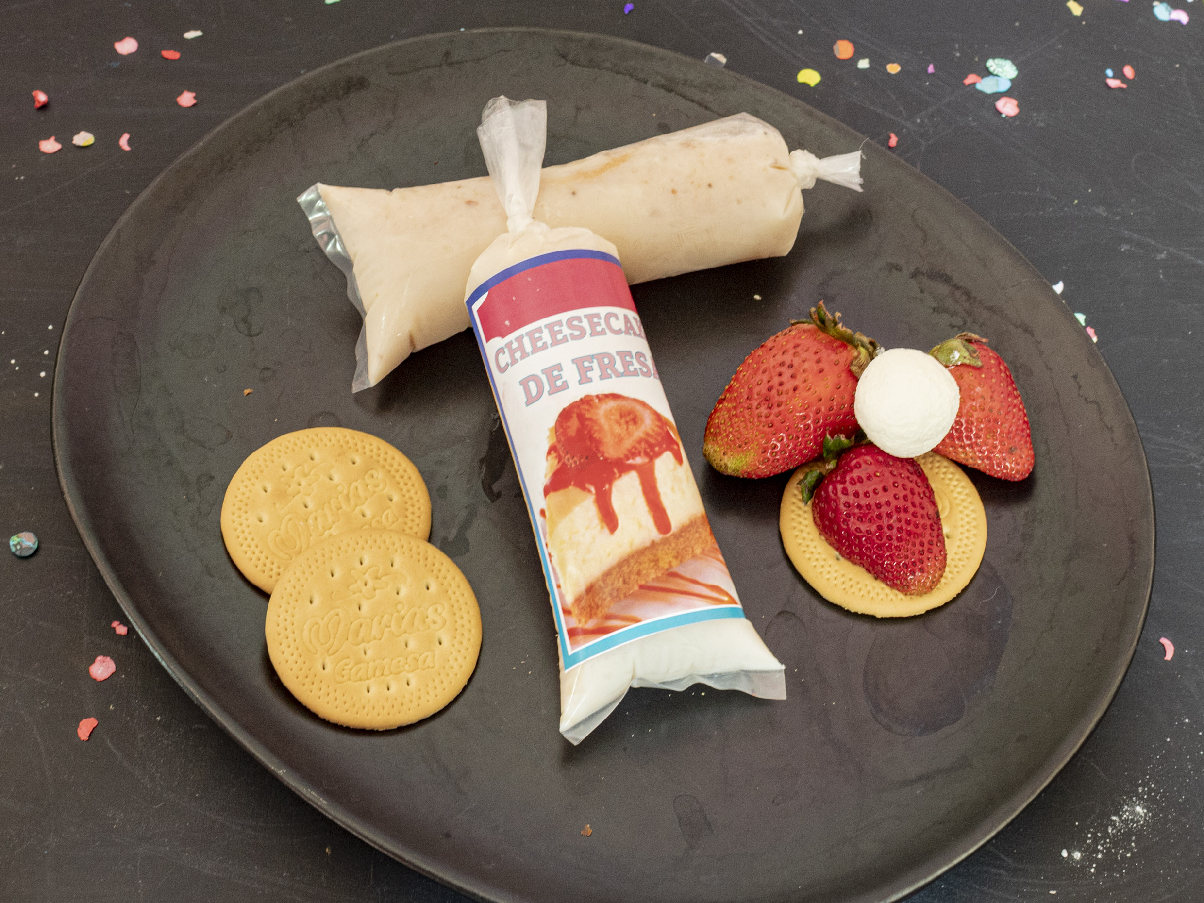 Rellena de queso crema Philadelphia, fresas naturales rebanadas, arándanos y lechera