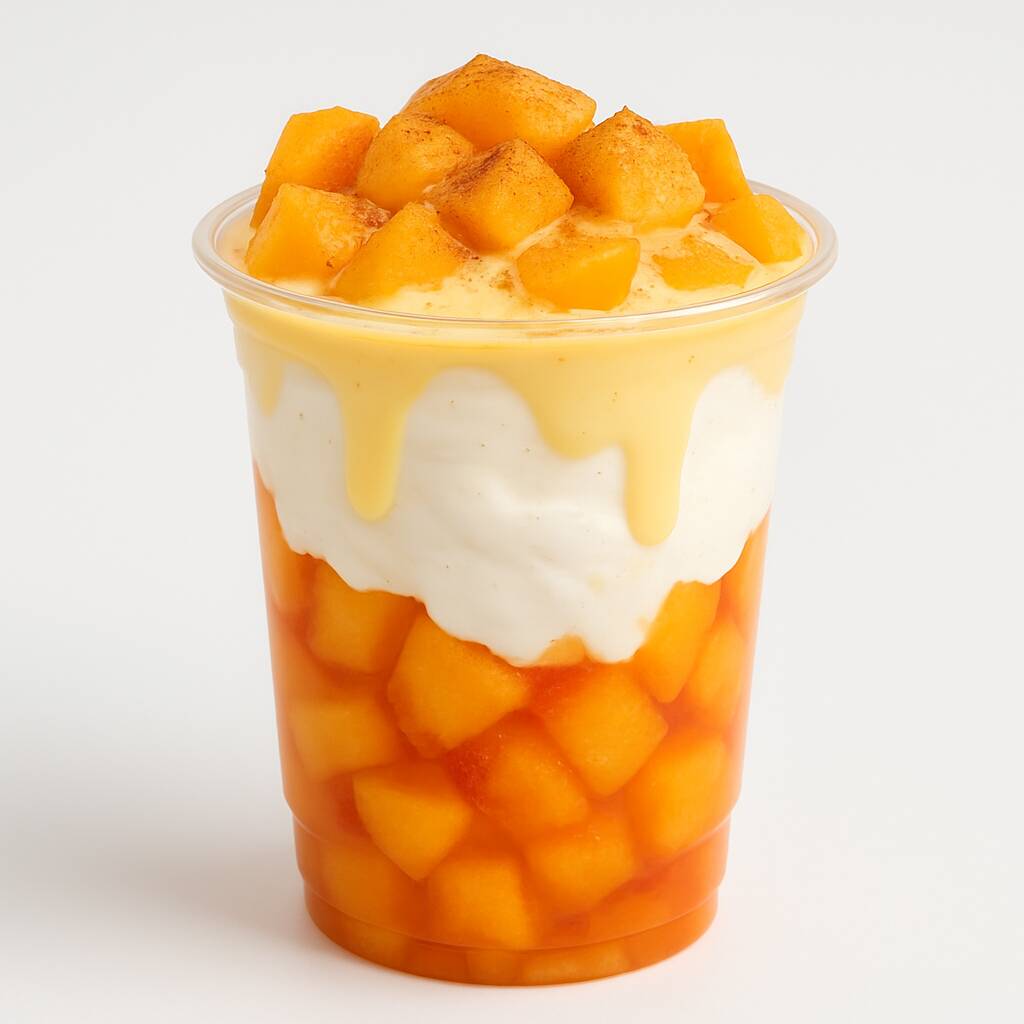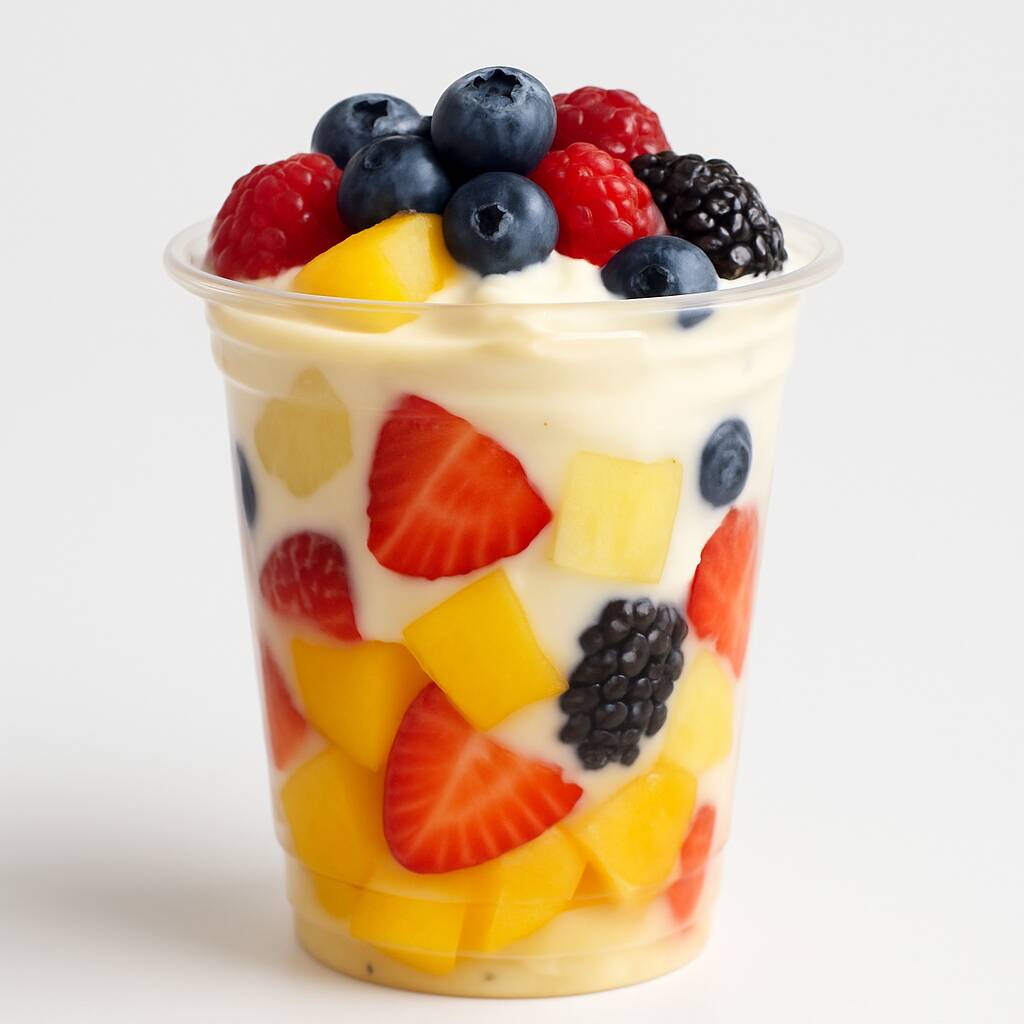 Vaso de 12oz durazno, fresas, piña, zarza, blueberry con crema, lechera.