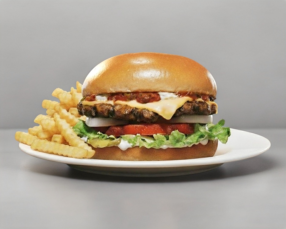 Una hamburguesa clasica (pan a elegir, mayonesa, lechuga, jitomate, cebolla, carne, queso americano, pepinillos, cátsup y mostaza) + papas o Nuggets + Bebida
