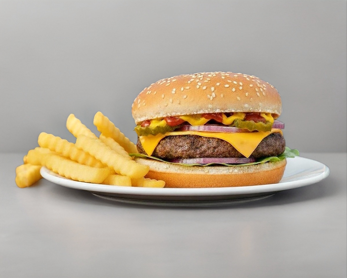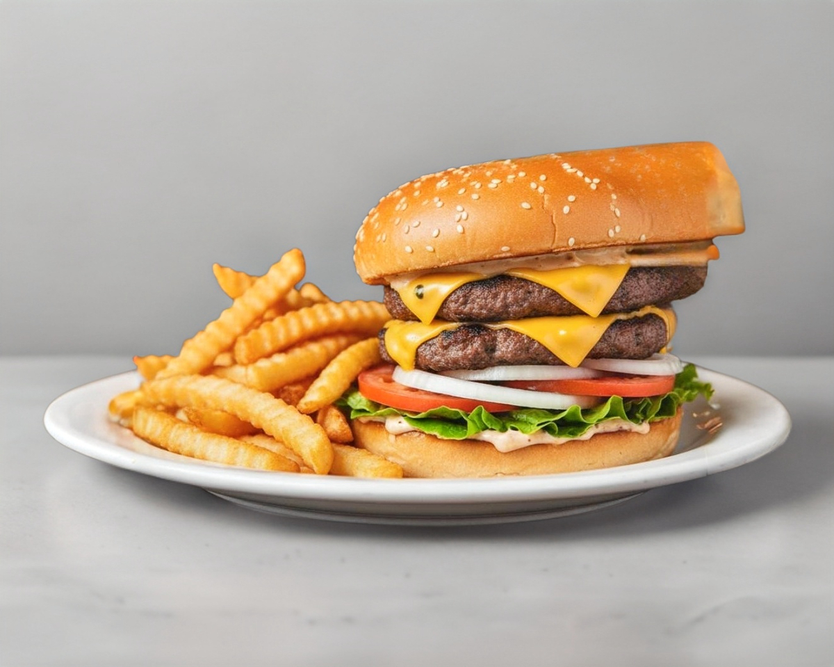 hamburguesa doble carne acompañada de refresco y papas