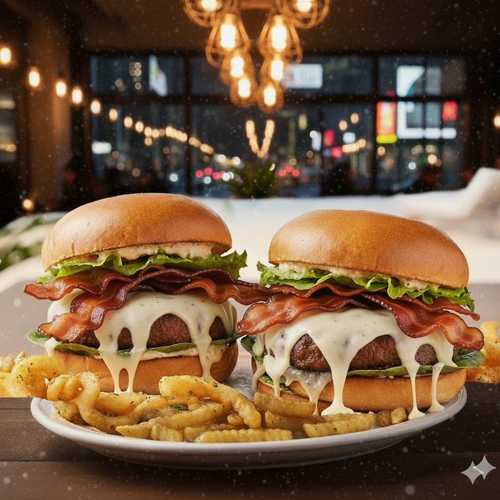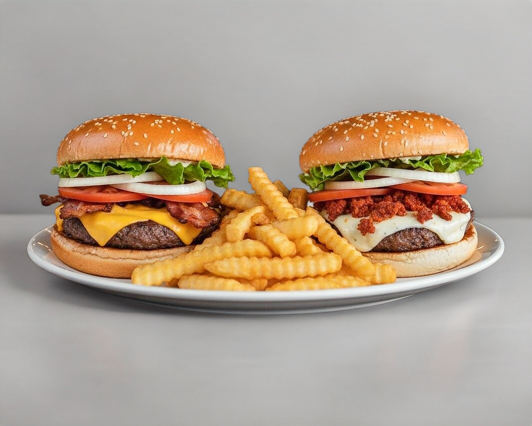2 hamburguesas tocino y queso (cada una lleva pan, mayonesa, lechuga, jitomate, cebolla, carne, queso americano, pepinillos, tocino y quesillo, catsup y mostaza) + papas francesas o nuggets + bebida