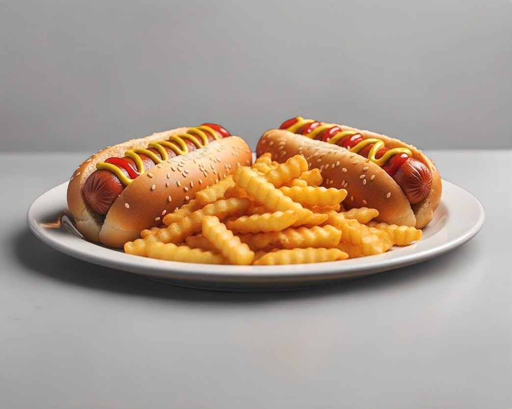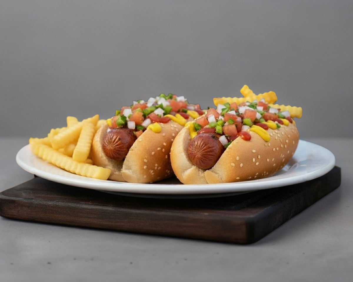 2 Hotdogs clasicos (cada uno con pan, salchicha, mayonesa, jitomate, cebolla, catsup y mostaza) + papas francesas o nuggets + bebida