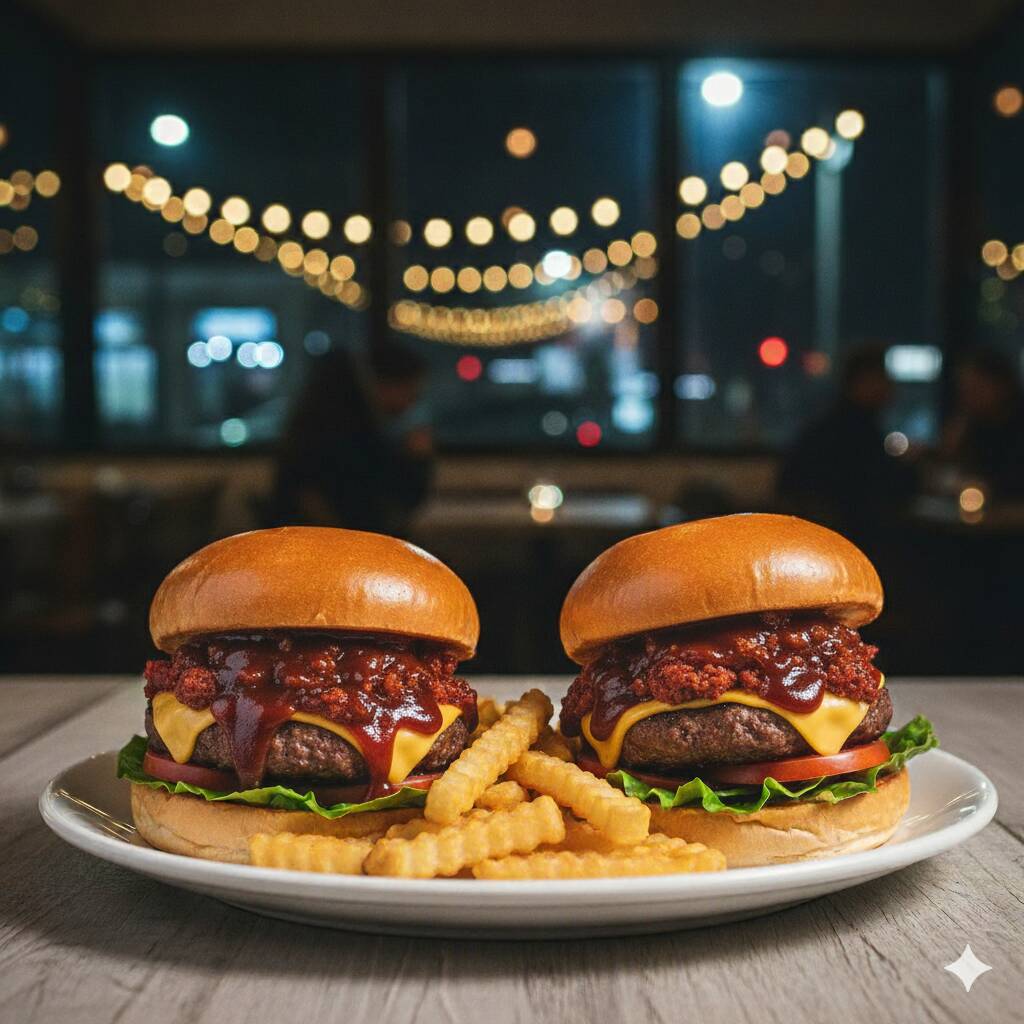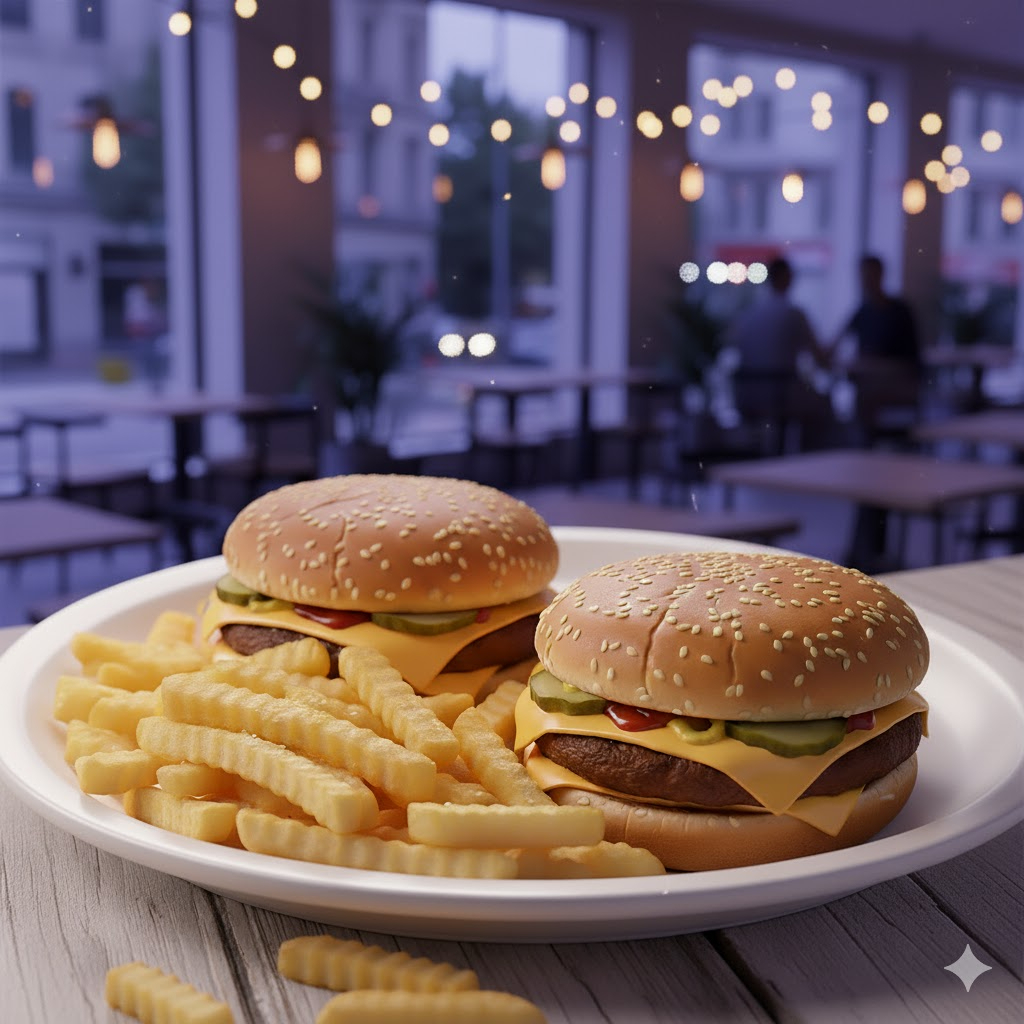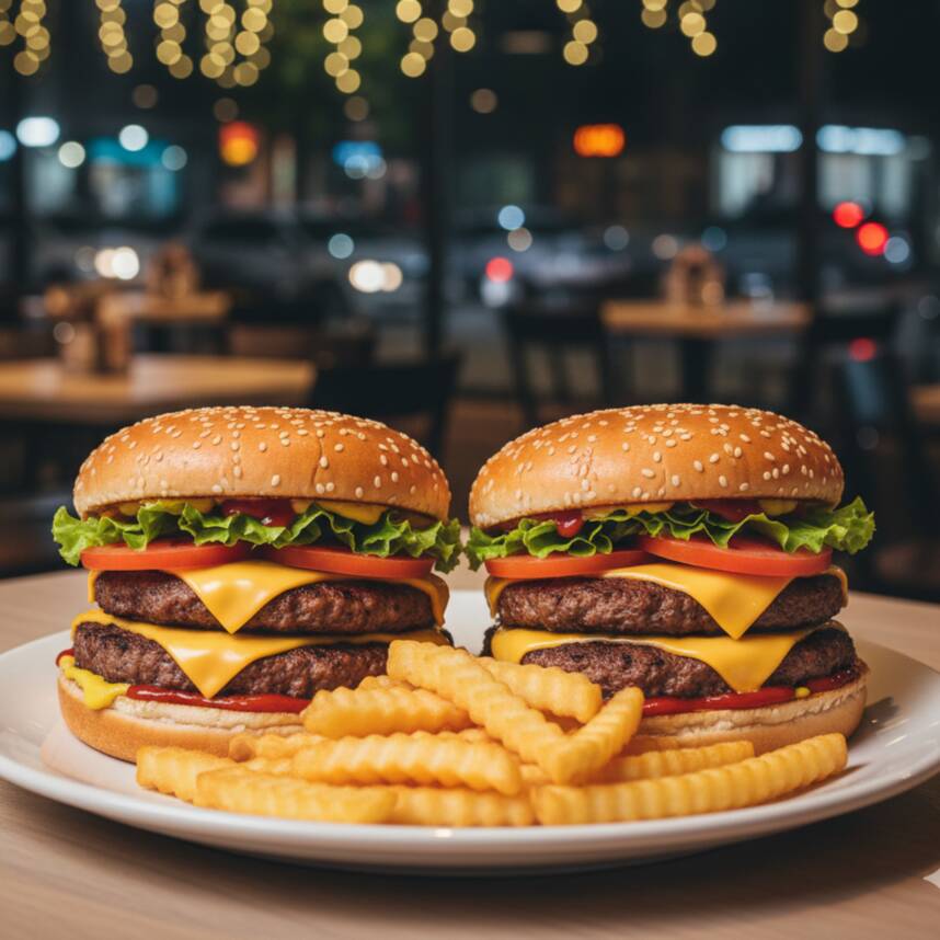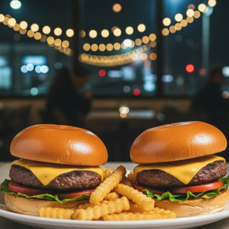 2 Doble Cheese Burgers ( cada una con: mayonesa, carne, queso americano, queso manchego, pepinillos, catsup y mostaza) + papas francesas o nuggets + bebida