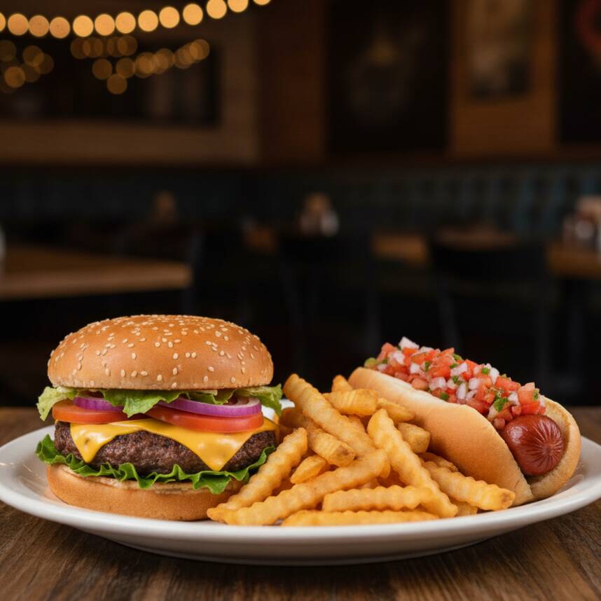 Hamburguesa Clasica (pan, mayonesa, carne, queso americano, lechuga, jitomate, cebolla, pepinillos, catsup y mostaza) + 1 Hotdog Clasico (pan, salchicha, mayonesa, jitomate, cebolla, catsup y mostaza) + papas o nuggets + bebida