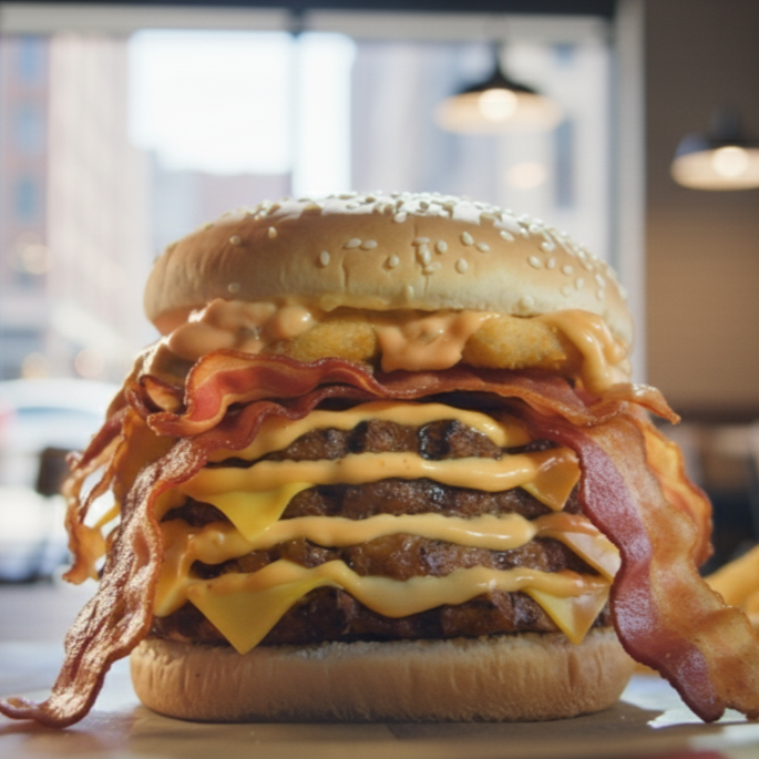 Bimbollo, 4 carnes de res, 4 quesos americanos, tocino ahumado, aros de cebolla, mayonesa, catsup mostaza,