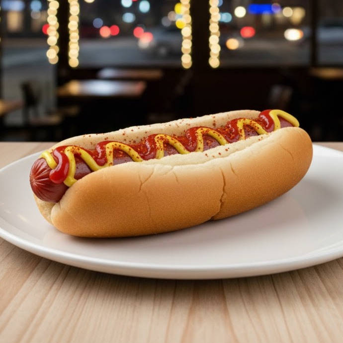 Media noche, mayonesa, salchicha, jitomate cebolla, mostaza y catsup.