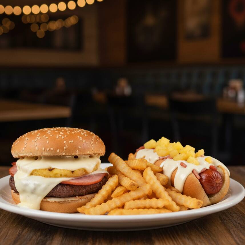 Hamburguesa Hawaiana (pan, mayonesa, carne, queso americano, lechuga, jitomate, cebolla, pepinillos, piña, jamon, quesillo, catsup y mostaza, + jotdog hawaiano (pan, salchicha, mayonesa, jitomate, cebolla, catsup, mostaza, piña, jamon y quesillo) + papas o nuggets + bebida