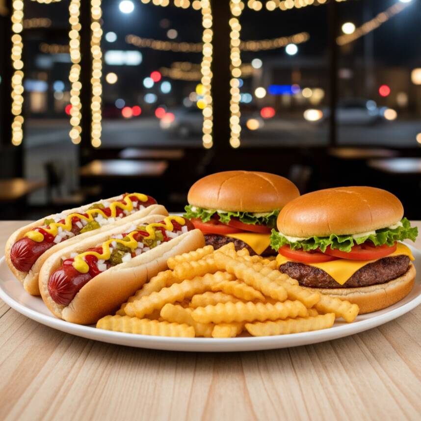 Elige tu hamburguesa + elige tu hotdog + papas francesas o nuggets + refresco de sabor