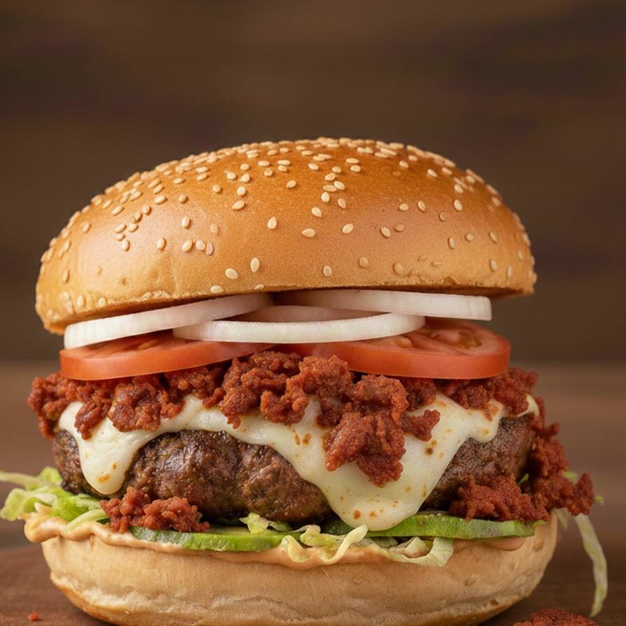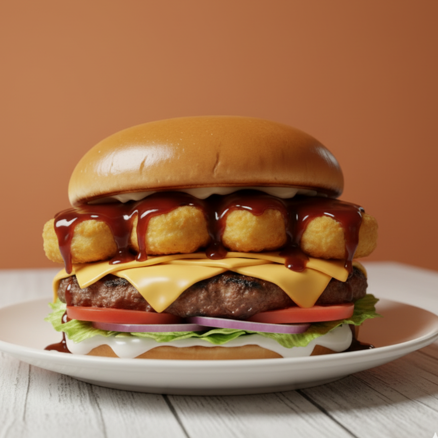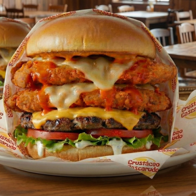 Olvídate de las reglas; reinventamos el placer. Con una montaña de nuggets dorados y perfectamente crujientes apilados en cada bocado, esta hamburguesa te garantiza múltiples puntos de crunch y la diversión de tu infancia, elevada a la máxima potencia. para tu paladar, escoge entre nuestra deliciosa carne de res o nuestra pechuga de pollo para exceder tus crujidos