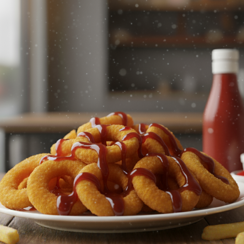 Aros de cebollas empanizados llevan catsup, ranch y picante Todo va aparte :3