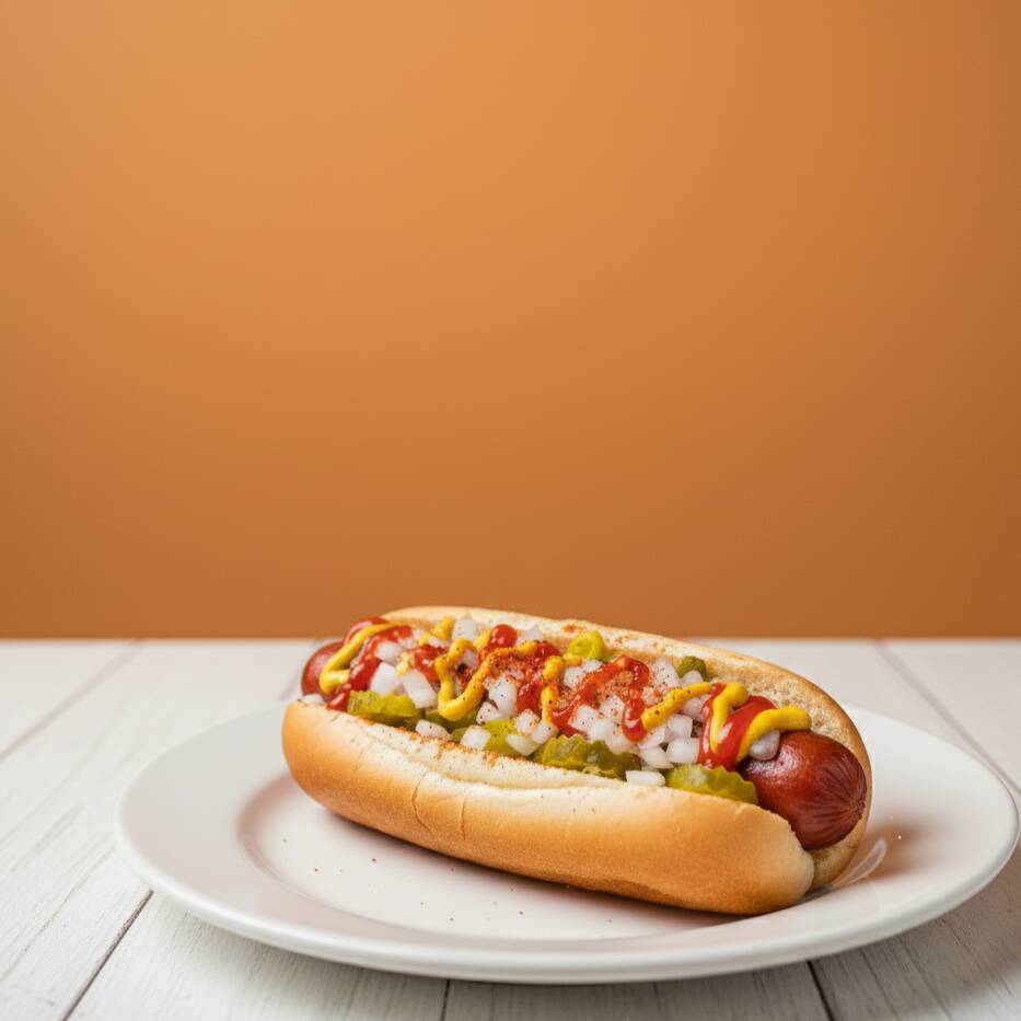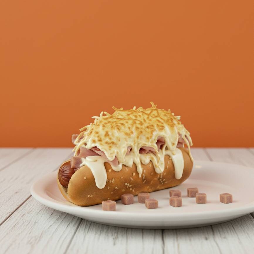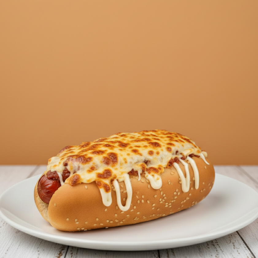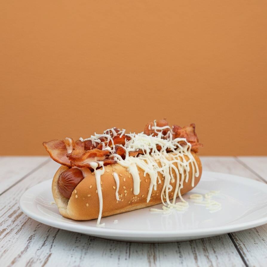 Delicioso Jotdog de media noche bimbo, con salchicha, tocino, quesillo gratinado, mayonesa, catsup, mayonesa, jitomate, cebolla, y picante a tu gusto