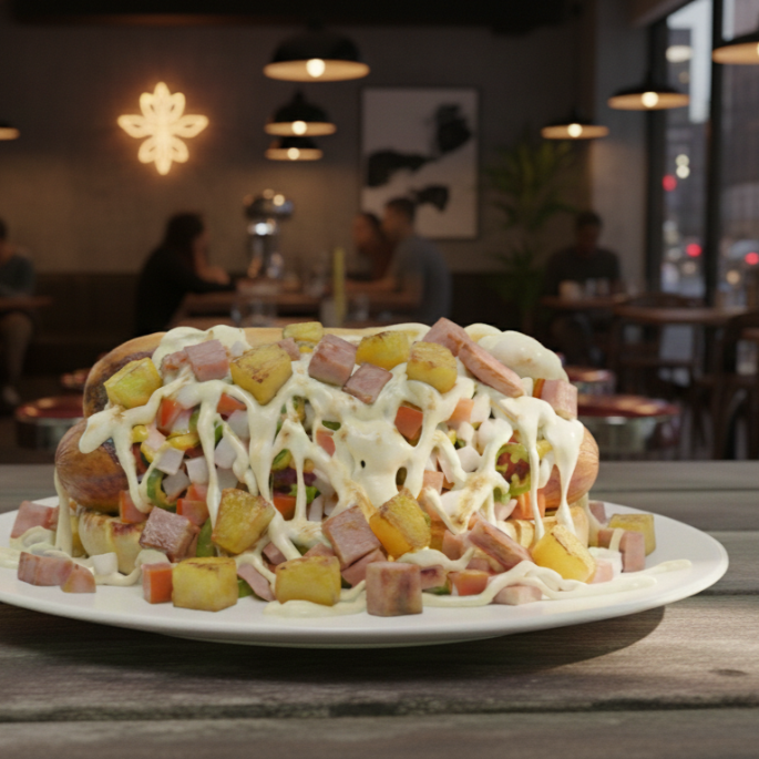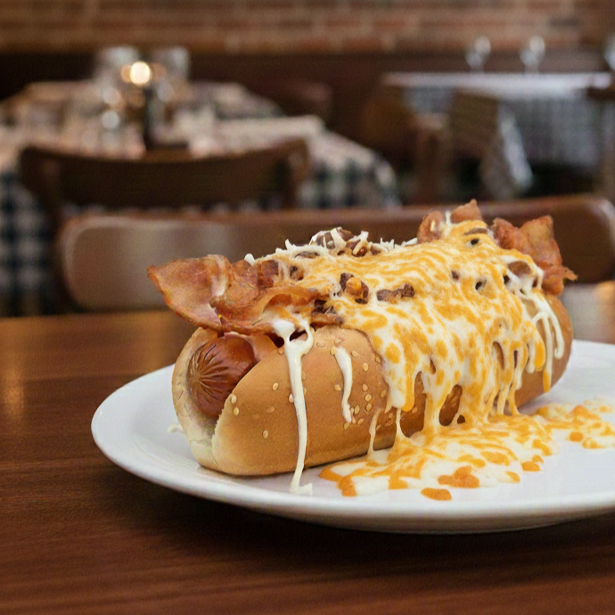 Prepárate para el 'factor wow'. Nuestra base es la salchicha de pavo, pero la estrella es el topping: una capa abundante de quesillo derretido y chicloso que abraza al jamón ahumado y a la piña jugosa asada a la parrilla. Cada mordida es un placer fundido que te transporta a la playa en hawai, complementado con los vegetales y aderezos que le dan ese toque unico