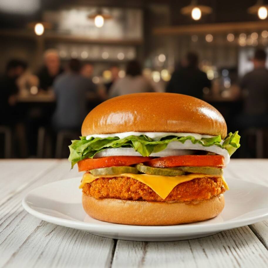 Escucha el crujido que lo cambia todo. Por fuera, la capa dorada y perfecta; por dentro, una pechuga de pollo increíblemente jugosa. La hamburguesa que se siente y se saborea en tu paladar combinando los vegetales y aderezos y el toque del picante a tu eleccion para disfrutar al 100 esta hamburguesa