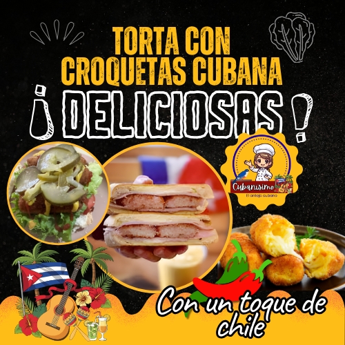 Deliciosa Torta con croquetas cubanas + salsas, ensaladas, chiles, cilantro, cebolla, pepino en curtido y mayonesa.