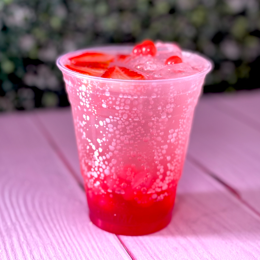 Bebida refrescante, con jarabe, agua mineral, y perlas explosivas.