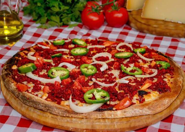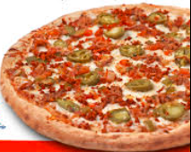 10 rebanadas. Pizza con cebolla, jalapeño, chorizo, tocino y frijoles, llena de sabor y tradición.