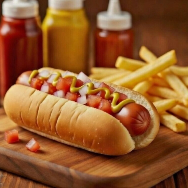 Déjate seducir por 100 gramos de carne jugosa, fundido en queso manchego, acompañado de salchicha estilo Frankfurt y salami. Todo ello realzado con cebolla caramelizada, lechuga crujiente, jitomate fresco y aderezos a tu gusto: ketchup, mayonesa, mostaza y chiles en vinagre. ¡Una explosión de sabores que te dejará sin aliento!